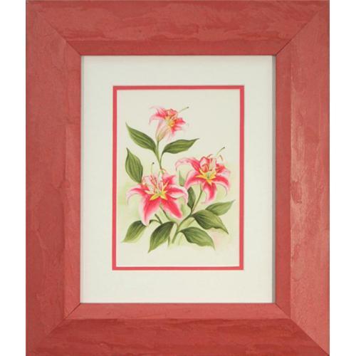?Pink Lilies in Bloom? is a vibrant print of an original watercolor by Canadian artist Sereeme. Three bright Stargazer lilies reach toward the sun in this lovely decorative print. The shock of bright yellow at the center their centers are surrounded by saturations of deep magenta on each petal that gracefully shifts outward through wonderful shades of pink before fading into the palest pink at each of their gently curled tips. The soft green stems and lush leaves were painted with crisp sweeping brushstrokes that reinforce the organic, curvilinear approach to the composition. The print is double matted in a deep pink bottom mat and soft white top mat that open the composition up into space. The piece is framed in a beautifully textured wood frame in a gorgeous shade of pink to further compliment the bold flowers. Including the frame, this picture measures ?16 ½?x19 ½? and would be a colorful, and affordable way to brighten up any room in your home.