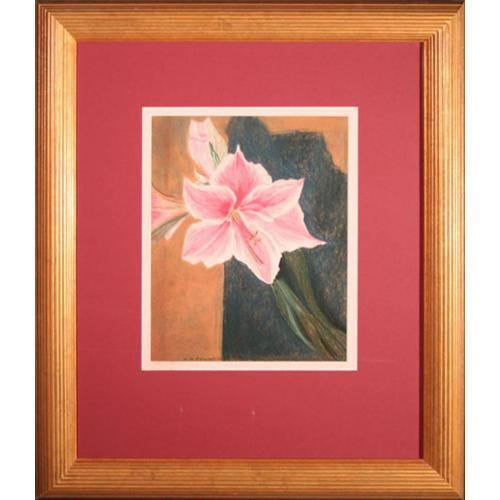 Rose Brown?s original pastel drawing entitled ?Pink Lily Stems? captures a dramatic stem of stunning stargazer lilies. Brown has rendered the soft pink flower petals in such detail that the bends and folds of the flowers appear to shimmer before you. The intense contrast of the deep tan and blue background against the pale pinks of the gorgeous lilies pushes them to the foreground of the composition. The subtle contouring of the flowers is rendered with delicate shifts of light and shadow, even incorporating soft grays and white to show the slight reflections of the tan and dark blue background. This beautiful drawing is double matted in a powder rose bottom mat which brings out the deepest of the pinks within the lilies, and a cranberry top mat which compliments the dark inner shadows near the stamen of the flowers within the composition. The piece is mounted in gold with gray antique wood frame which echoes the soft highlights of the background and brings the overall measurements to 24.25? x 28.25.? This is truly a gorgeous, and affordable, original drawing that would be the perfect gift for the floral enthusiast in your family.
