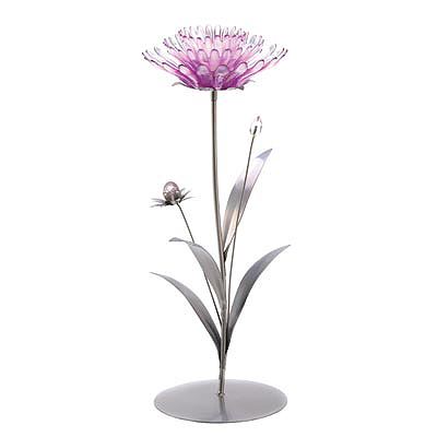 Pink Lotus Tealight Holder **|**|** Gorgeous pink lotus flower in full bloom supports a single tealight at its center in this dramatic tabletop candle holder. Its silver base rises up with elegant leaves and baby flower buds in clear and light pink crystal. 7 diameter x 19" high. Iron, glass and acrylic. Candle not included. "