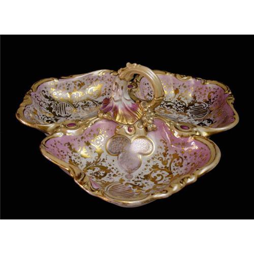 Important pink and gold lusterware, three-section handled-dish. It is unmarked on the underside as older pieces often are. Manufacturer unknown but lusterware was popular in Victorian England and manufactured by Spode, Wedgwood and Sunderland. Pink is a color particularly sought-after by lusterware collectors. In good used condition with wear to gilt and restoration. Please ask questions, request additional photos and shipping costs before buying.