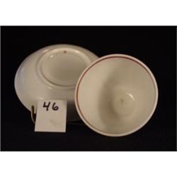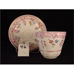 Pink Lustre handleless cup & saucer ca. 1830-1859, lobe-molded body. Leafy design w/scalloped reserves in which green leaves & stylized flowerheads are enameled in red & blue. The 5 1/2" saucer is marked "3" underneath in pin. Cup is 2 3/4" tall and 3 1/4" wide. Some wear to lustre but no damage.