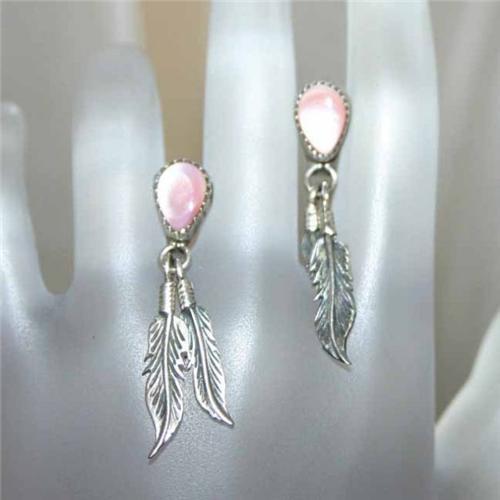 A beautiful light Pink Teardrop shaped genuine Moonstone has been bezel set in these fabulous vintage Indian made Sterling Silver Pierced Earrings. Attached are two well detailed feathers on each Earring, measuring 1 ¼ inches long by 2/8 of an inch wide. Beautiful, feminine and very pretty!