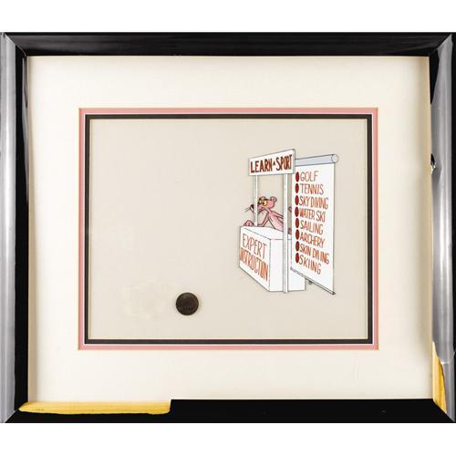 <B>Pink Panther Animation Production Cel Original Art (DePatie-Freleng, undated).</B></I> The Pink Panther runs a "Learn a Sport" stand, in this hand-painted animation production cel. Production number: 0242. The cel has an image area of 11" x 8.5". Matted and framed and in Excellent condition. Includes a DePatie-Freleng seal. <BR><BR><B>Important notice:</B> Heritage usually auctions material at the rate of 200-250 lots per hour. On some occasions eBay Live bid software or the Internet may not be able to keep up with the pace of the auction. We recommend placing a realistic absentee bid now as insurance to avoid disappointment. Occasionally the auctioneer may eliminate or reject an eBay Live bid, and the auctioneer may also reopen a lot after the close of the eBay live bidding (usually because we missed an audience bid), and may reject your bid even if it shows you as the winning bidder. By bidding via eBay Live, you agree that Heritage may award the lot to another bidder at its sole discretion under the circumstances described above or any other reasonable circumstances. Since eBay bids are not shown to us until we open the lot on the floor, we treat those bids just like floor bids. In most cases the floor responds before the eBay bid is presented to us, due to Internet lag time, so for consistency we have made it a policy that floor bids are always considered first over tie eBay live bids. Also please note that all Heritage lots purchased through eBay Live carry a 22.5% Buyer's Premium. Please make sure you read the Terms and Conditions before you bid. This lot is being auctioned in conjunction with a live floor auction by Heritage Auction Galleries. All final auction and invoice information will be supplied by Heritage Auction Galleries, and all other information should be considered preliminary. Lot:41001 <BR><BR><B>Winning Notification and Billing:</B> After the FINAL session in this auction is complete, Heritage will send e-mail and snail mail invoices. This process normally takes several days. All final auction and invoice information will be supplied by Heritage Auction Galleries, and all other information should be considered preliminary. <BR><BR>This auction will be conducted on a live auction floor and over the Internet through eBay Live. If you choose to place an absentee bid, please take a moment to <font color='#0000ff'><u><a href='http://pages.ebay.com/liveauctions/help/before/laabsentee.html'>learn how eBay Live absentee bidding works</a></u></font><font color='#000000'>