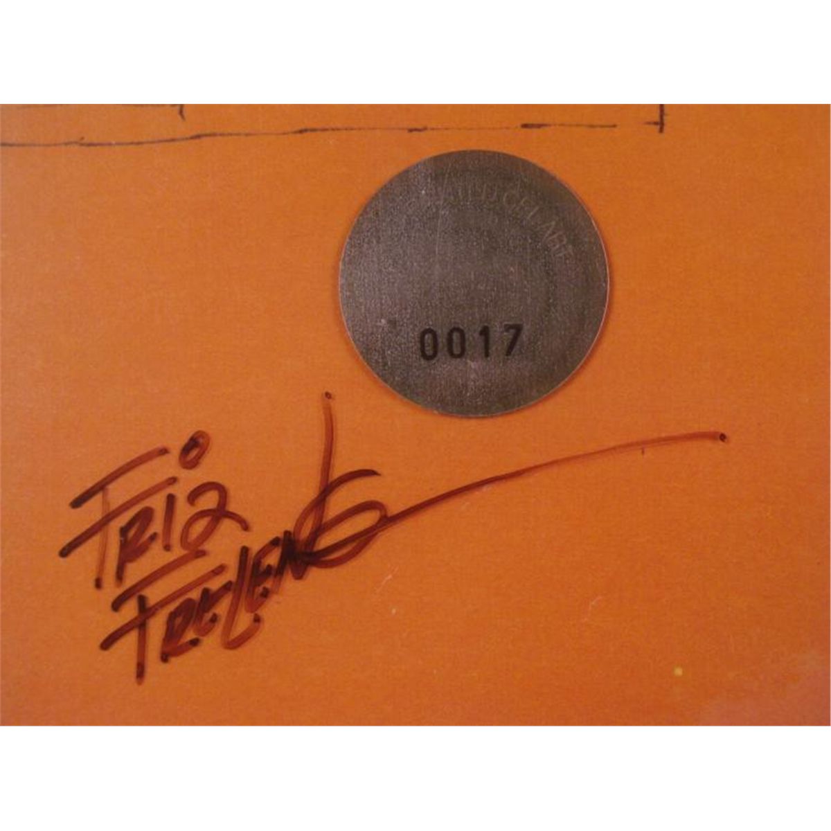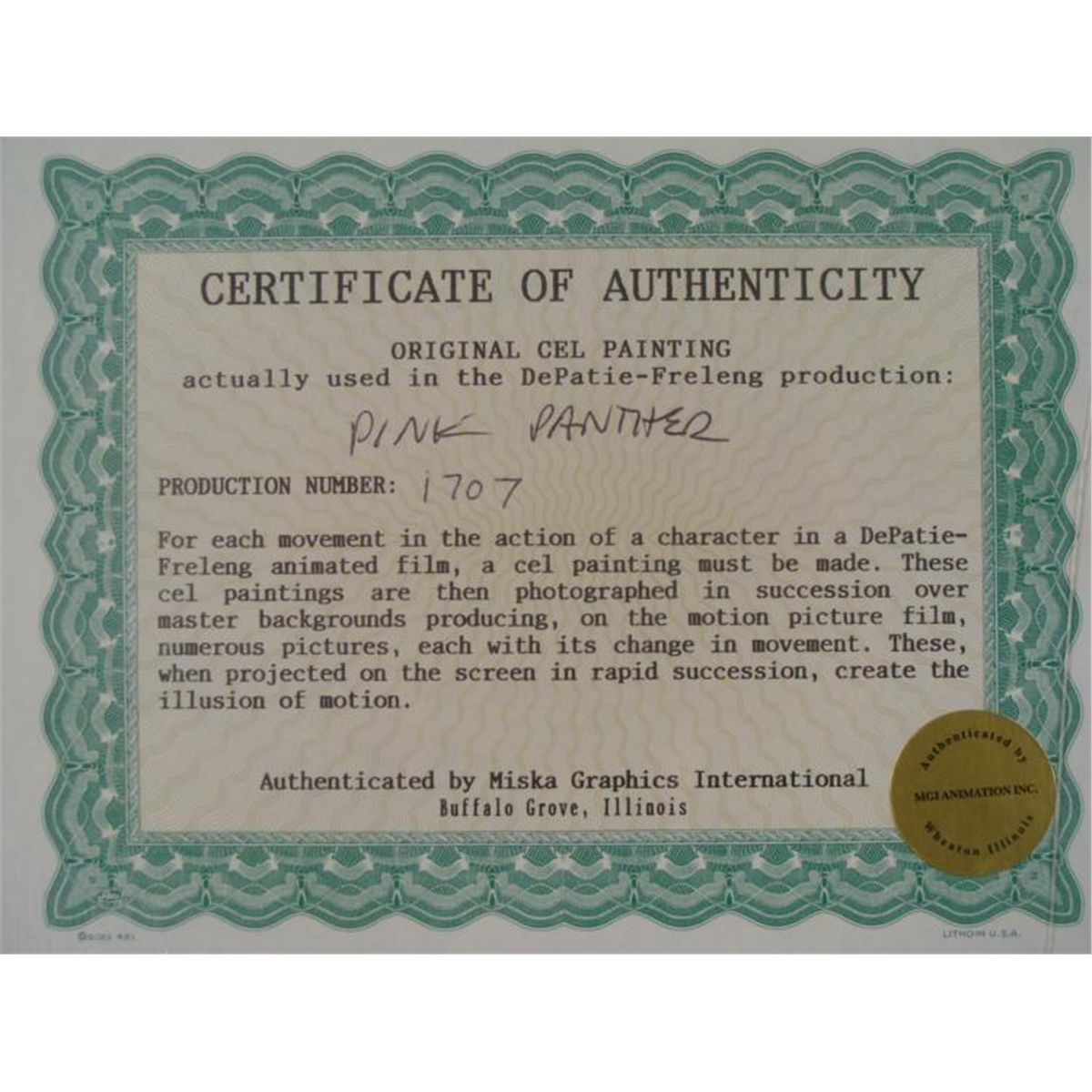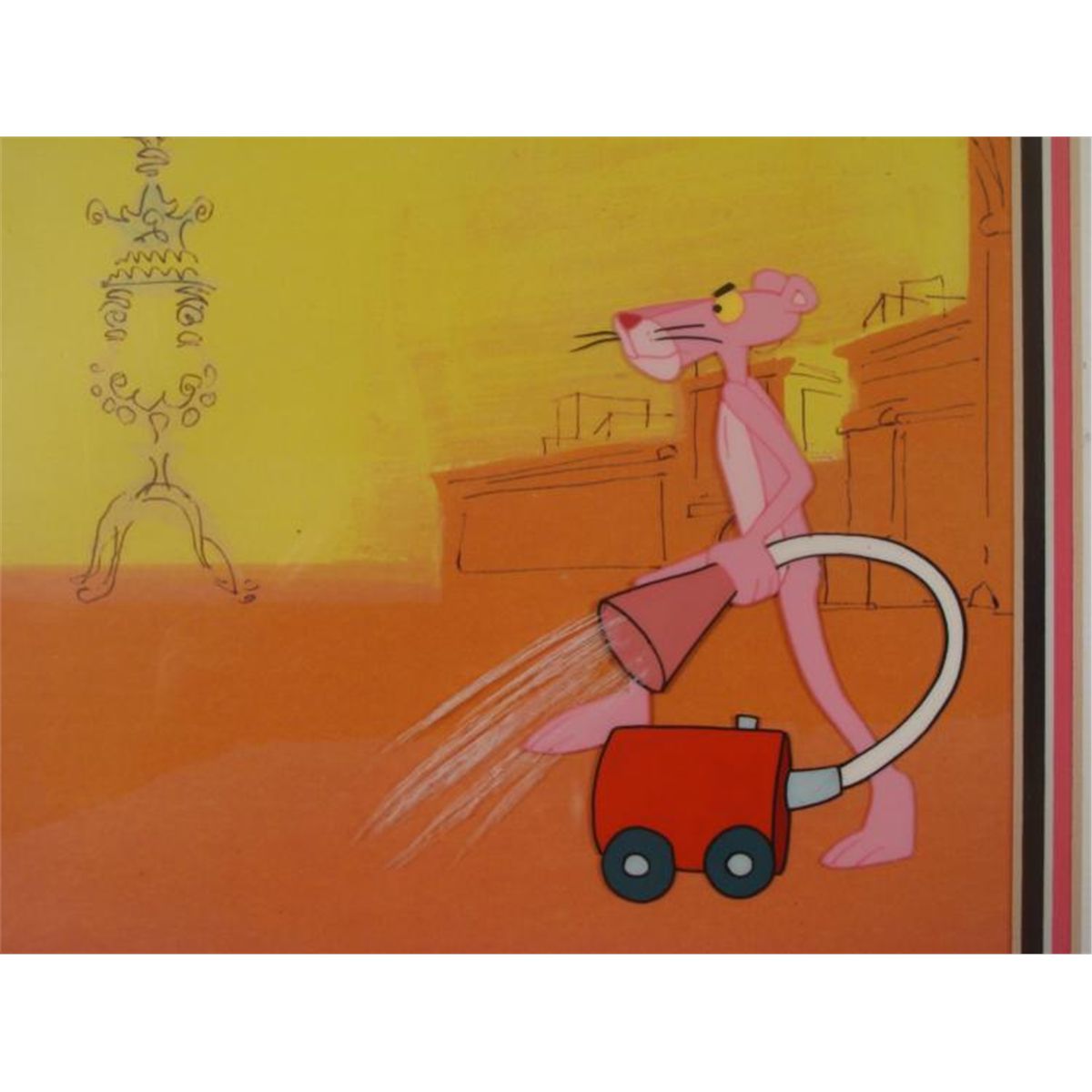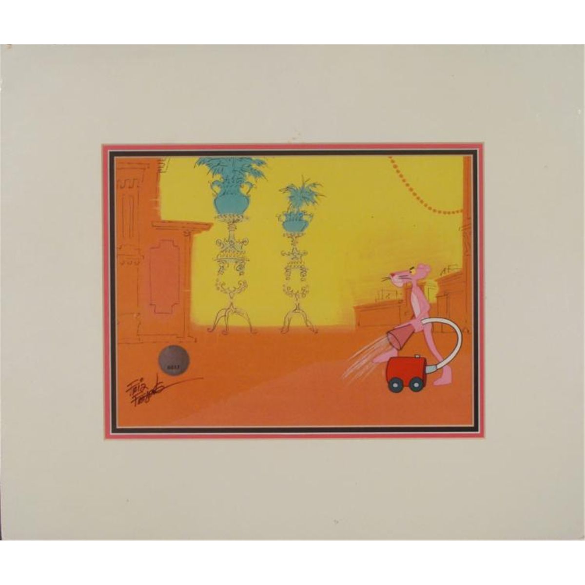 This is an original animation cel and background used in a DePatie-Freleng production of The Pink Panther Show cartoon. This one is extra special because it is signed by the legendary animator Friz Freleng! The program ran on television throughout the 1970's. The scene has Pink at a hotel, using the vacuum for some crazy purpose. * Medium: Hand painted acetate cel with printed backgroundSignature: In black marker, lower leftImage size: 11 1/4 x 8 3/4 inches Presentation: Triple matted in red, white, and blackMatte size: 19 x 16 inchesCondition: Excellent; sealed in cellophaneCertificate of Authenticity: Included, with matching hologram sticker on front