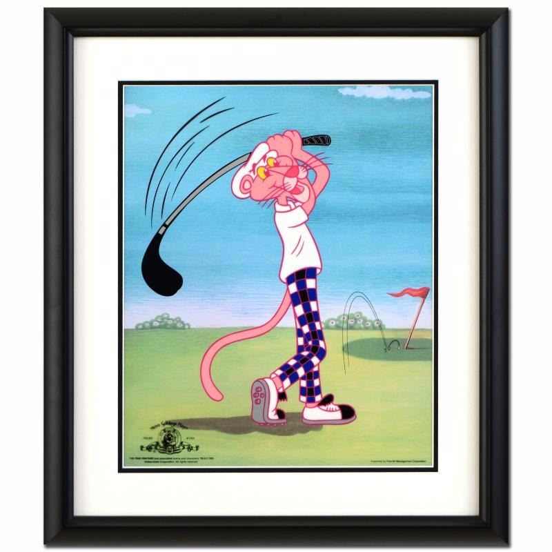 "Pink Panther Golfing" is a sericel with a vivid full-color background, officially licensed by MGM and United Artists Corporation! This piece comes framed. Includes Certificate of Authenticity! Measures approx. 19.5" x 22.5" (frame), 13" x 15.5" (image). Retail Price $450.00. PRICE INCUDES FREE SHIPPING IN THE U.S. - SHIPPING WILL BE ADDED TO YOUR INVOICE FOR ALL BUYERS OUTSIDE OF THE U.S.