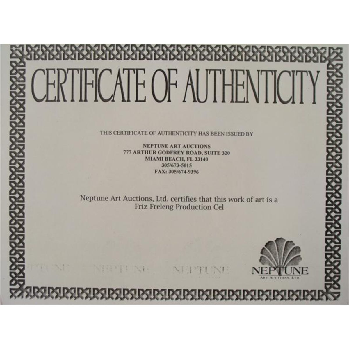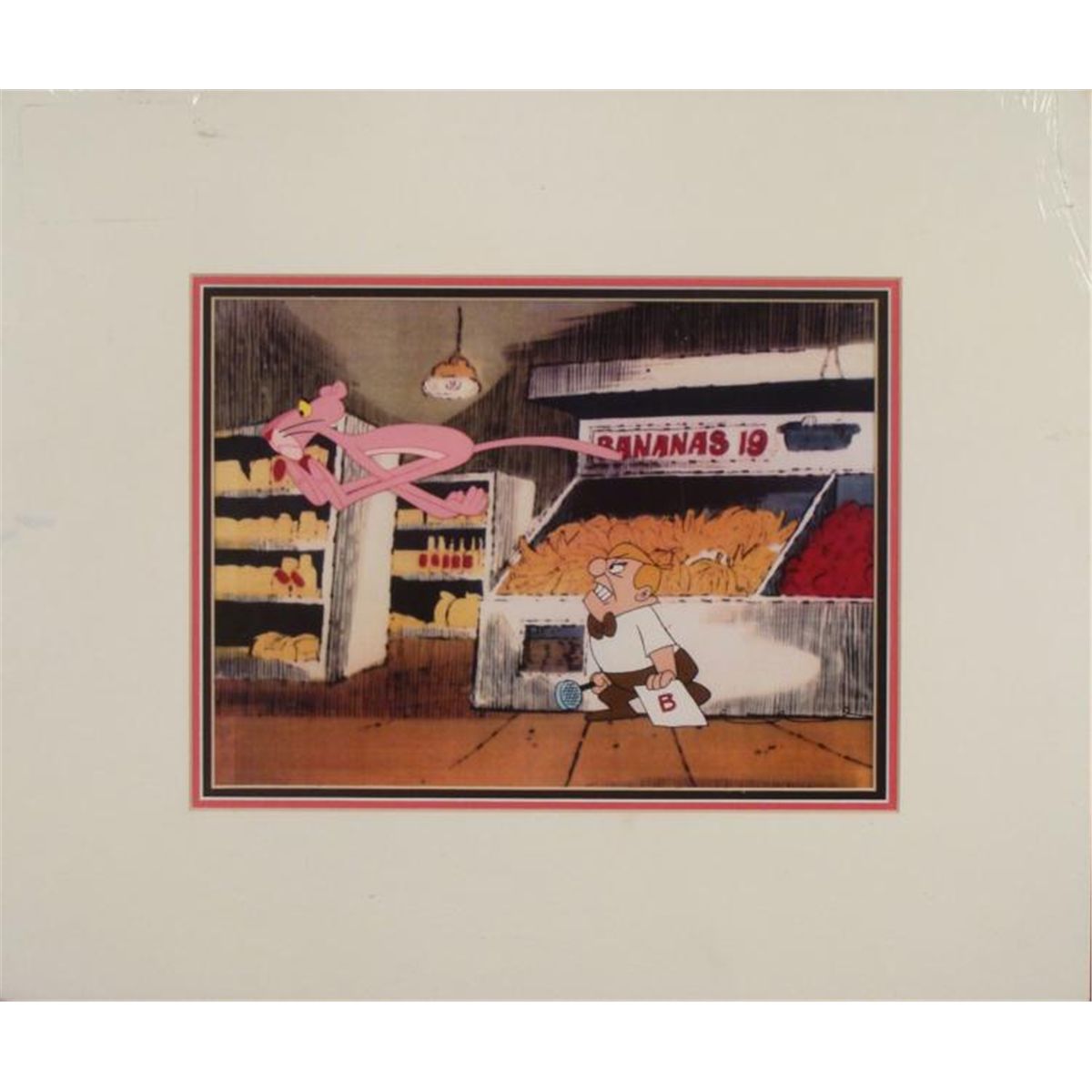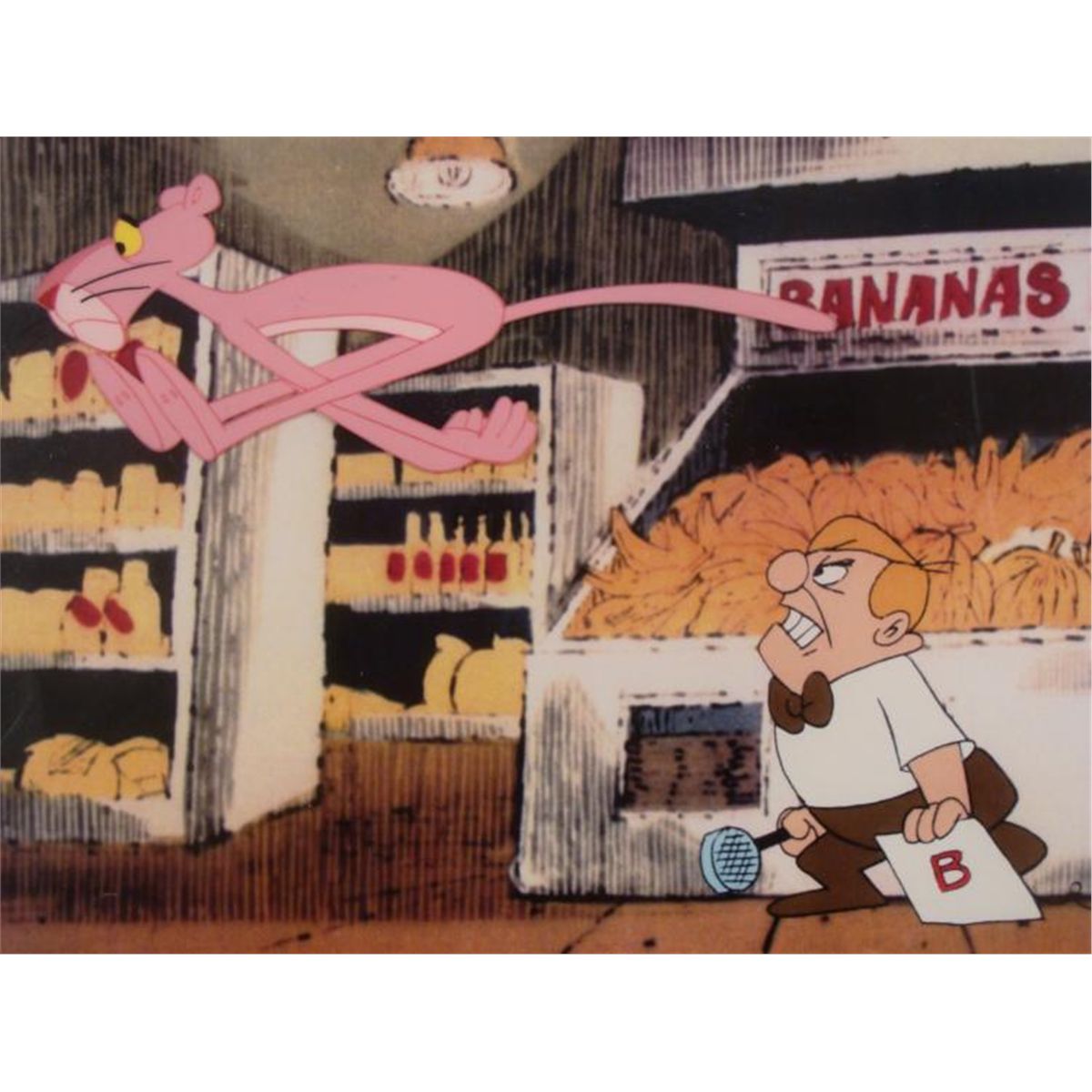 This is an original animation cel and background used in the production of The Pink Panther Show cartoon, done at the studio of Friz Freleng.  The program ran on television throughout the 1970's.  Pink has gotten himself into trouble, it seems, as a grocery store manager chases him from the store.   *  * Medium:  Hand-inked and hand-painted acetate cel with printed backgroundImage size: 11 1/2 x 8 1/4 inches Presentation: Triple matted in red, white and blackMatte size: 19 x 16 inches Condition: Excellent; sealed in cellophaneCertificate of Authenticity: Included
