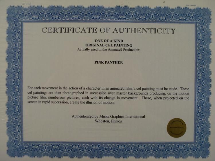 This is an original animation cel and background used in the production of The Pink Panther Show cartoon. The program ran on television throughout the 1970's. Pink has just stepped onto a stage, wearing a pink body suit and top hat- what an outfit! * Medium: Hand-inked and hand-painted acetate cel with printed backgroundImage size: 11 x 8 1/2 inches Presentation: Double matted in pink and whiteMatte size: 20 x 16 inchesCondition: Excellent; sealed in cellophaneCertificate of Authenticity: Included, with seal on front *