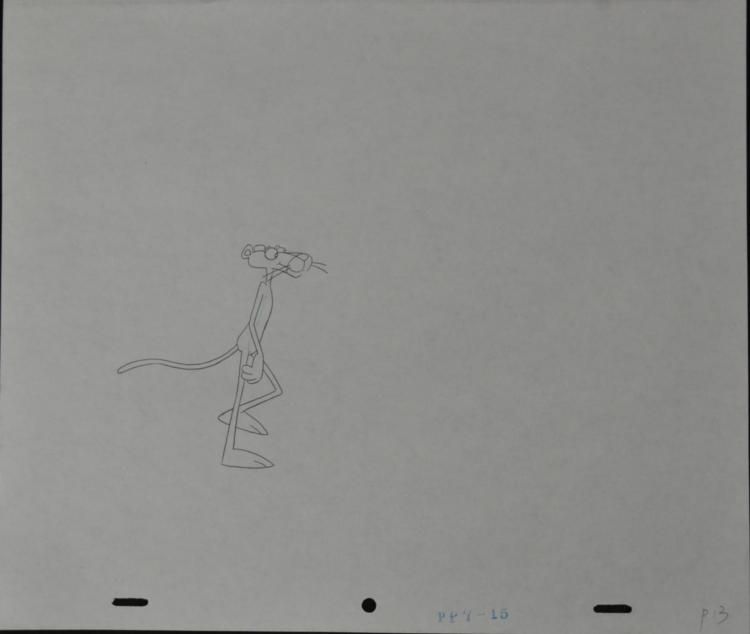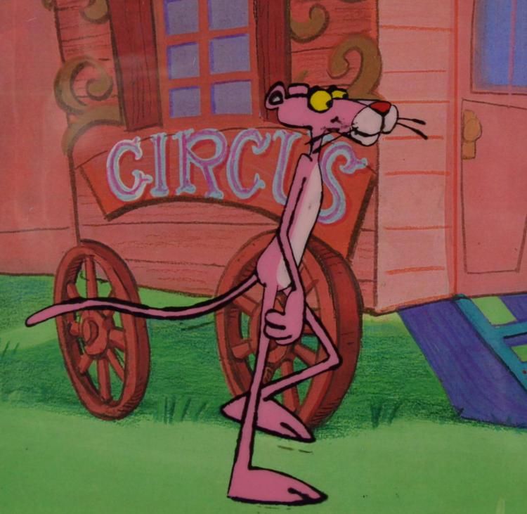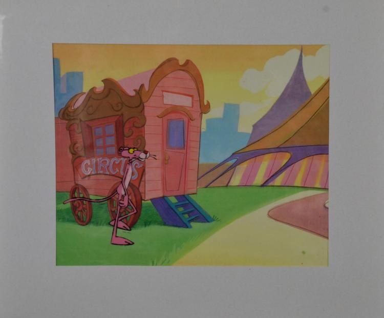 Here is an original animation cel and matching drawing used in the production of the cartoon series The Pink Panther. The circus is in town, and the Pink Panther strolls past a circus wagon and toward the big top. * Medium: Hand painted cel acetate with printed background; black and non-photo blue pencil on paperCel image size: 8 1/4 x 10 1/4 inchesDrawing sheet size: 10 1/2 x 12 1/2 inchesPresentation: In off-white matte, ready for framingMatte size: 12 3/4 x 14 3/4 inchesCondition: Excellent, sealed in plastic sleeve