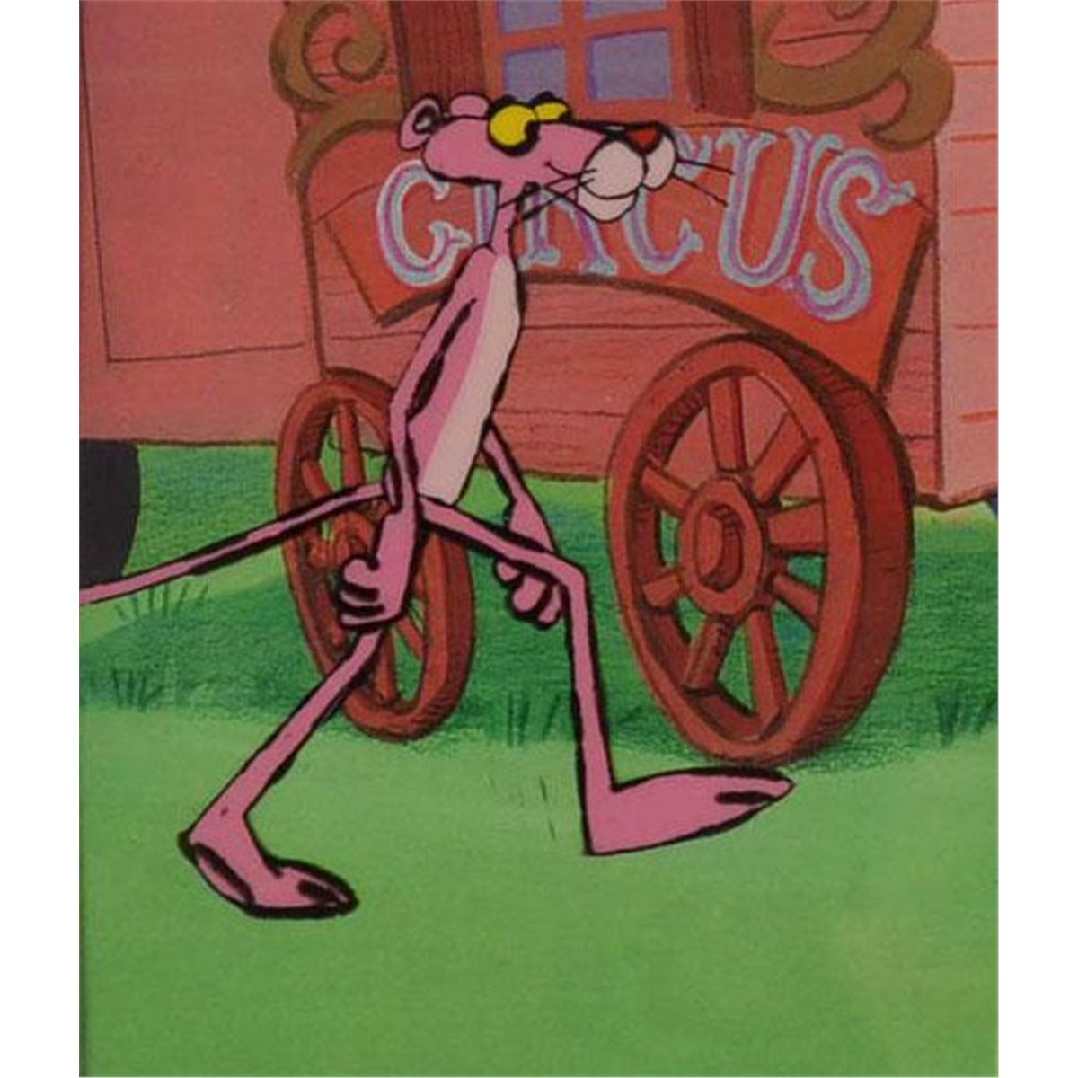 This is an original animation cel and matching drawing used in the production of the cartoon series The Pink Panther. The circus is in town, and the Pink Panther strolls past a circus wagon and toward the big top. * Medium: Hand painted cel acetate with printed background; black and non-photo blue pencil on paperCel image size: 8 1/4 x 10 1/4 inchesDrawing sheet size: 10 1/2 x 12 1/2 inchesPresentation: In off-white matte, ready for framingMatte size: 12 3/4 x 14 3/4 inchesCondition: Excellent, sealed in plastic sleeveCertificate of Authenticity: Included