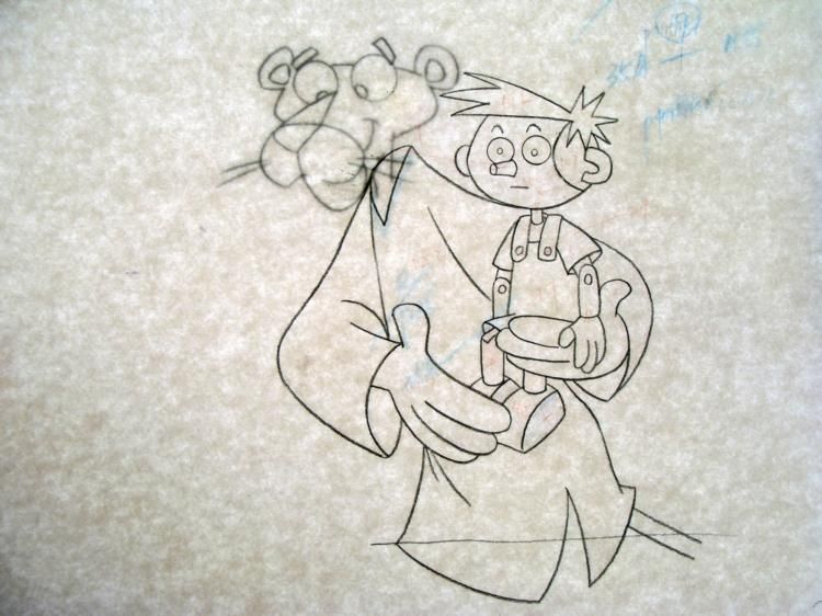 Here is an original animation cel and matching drawing used in the production of the cartoon series * The Pink Panther. The Pink Panther is in his workshop holding his pink wooden puppet, which looks reminiscent to Pinocchio. * * * * * * Medium: Hand painted cel acetate with printed background; black and non-photo blue pencil on paper * * * Cel image size: 8 1/4 x 10 1/4 inches * * * Drawing sheet size: 10 1/2 x 12 1/2 inches * * * Presentation: In off-white matte, ready for framing * * * Matte size: 12 3/4 x 14 3/4 inches * * * Condition: Excellent, sealed in plastic sleeve * This is an original hand-painted cel set-up used in the production of an episode of "The Pink Panther." Each one-of-a-kind set-up represents a slight change in position of the characters. When individually photographed and projected in rapid succession, * the images appear to move. * * To create production cels, the original animator's drawing is transferred onto an acetate cel (by hand-inking and/or photo copying). The cel is then hand-painted on the reverse side. The background accompanying this set-up is a printed reproduction background. * The cel received may be ever so slightly different than the one shown in the auction photo. * * Traditional animation is a multi-step process which includes various types of art techniques. Drawings are a key part of the process, in which the animator creates the design and movement of the * characters. Drawings are then transferred onto acetate cels (by hand-inking and/or photo copying) to create a production cel, which is then hand