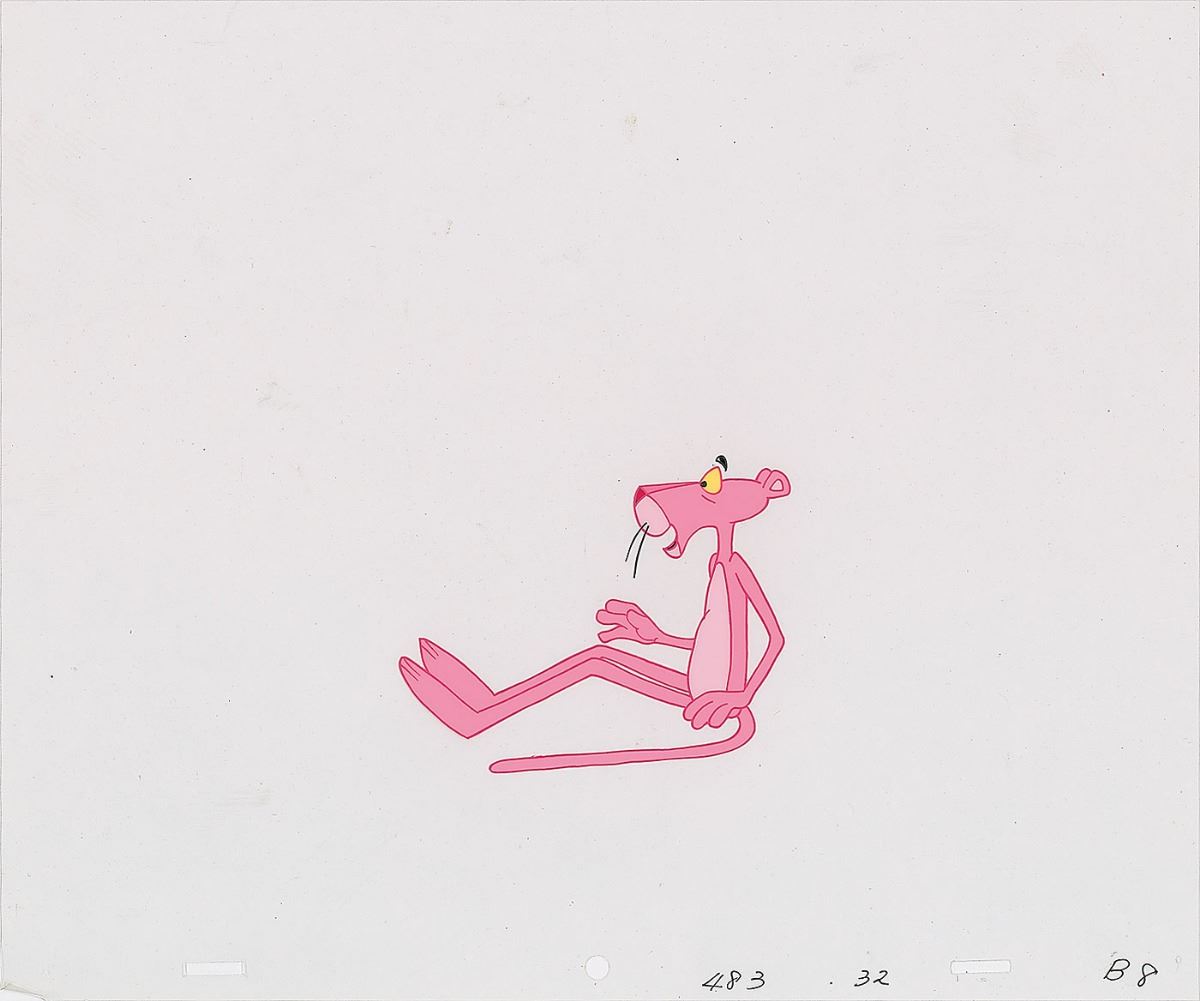 (DePatie-Freleng, circa 1980s) Three original production cels and matching drawings featuring Pink Panther from the Pink Panther TV show, showing him sitting, using a camera, and wearing a green hat. Images measure from 3.5 x 4 to 4 x 3, with overall dimensions of 12.5 x 10.5. In overall fine condition.