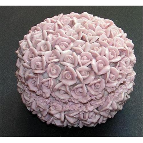 Produced in Germany during the early 20th century, and known as Elfinware this dresser jar features hundreds of small pink porcelain roses covering both lid and jar. Measuring about 4 1/2 inches across x 3 inches tall and, with the exception of a few nicked petals, is in excellent condition.