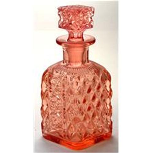 Produced during the 1930s, this Elegant pink Depression glass perfume decanter, lotion bottle or vanity bottle measures 6 inches tall, including its matching stopper, x 3 1/4 x 2 3/4 inches. Featuring a pressed intricate dimond shape and pattern with matching stopper. Very heavy glass, very well made with the look, feel, and heft of high end cut glass. In excellent condition for its age.
