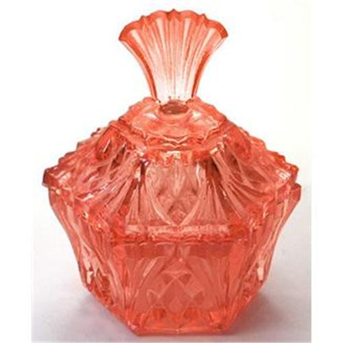Produced during the 1930s this Art Deco, pink pressed Depression glass, hexagonal 4 inch, powder jar is in excellent condition for its age. Features a fan shaped finial and the look and quality of cut glass.
