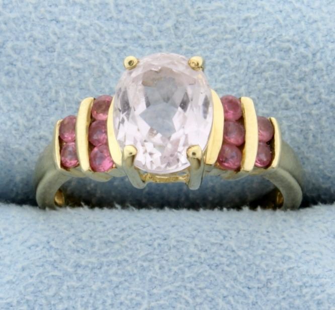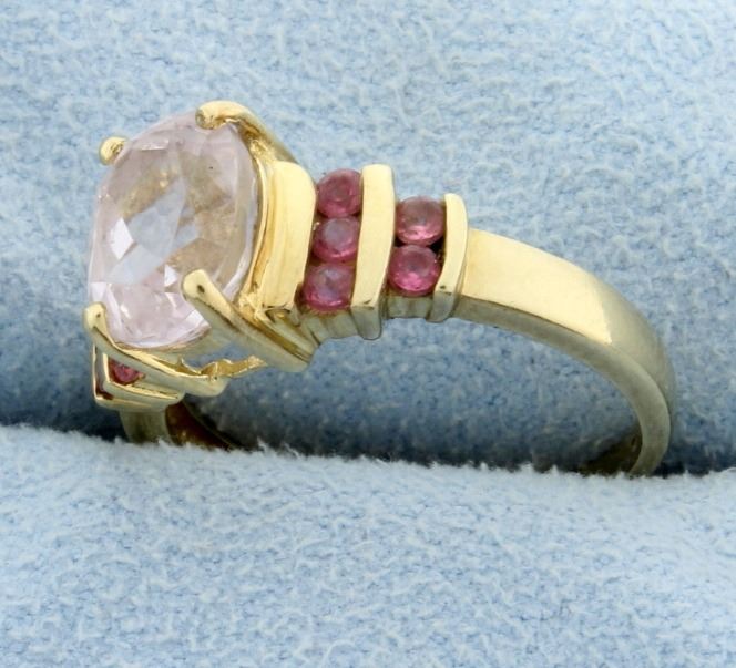 In 14K yellow gold. There is a 2.5ct oval pink quartz gemstone and ten 2mm round darker pink quartz gemstones in shank. Size 7 1/2 3.4g