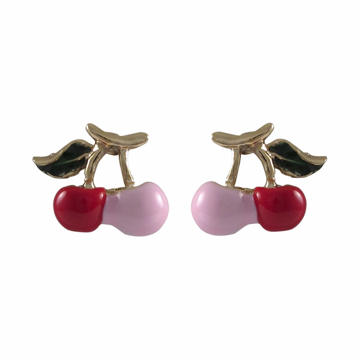 Pink/Red Enamel & Gold Plated Brass Cherry - Post Earrings And Necklace Set