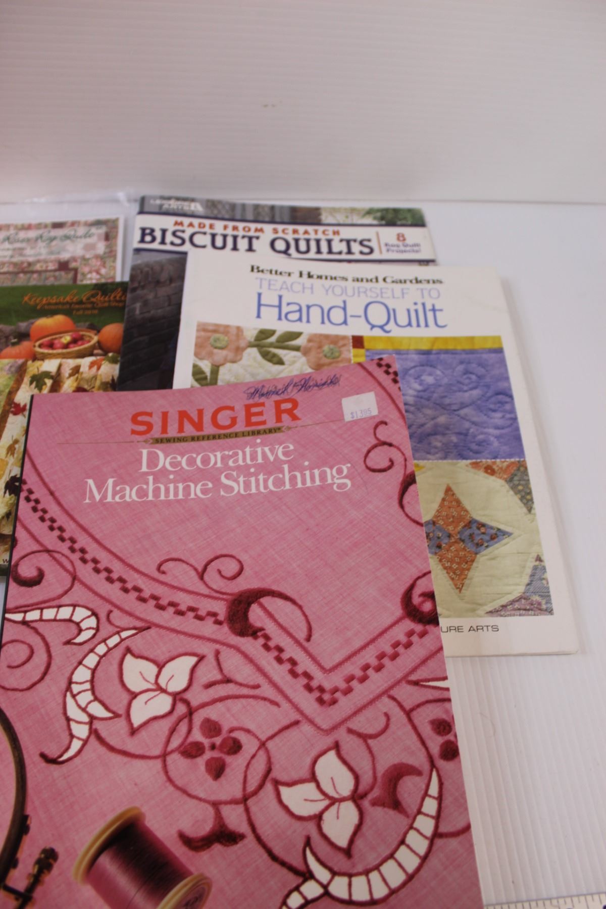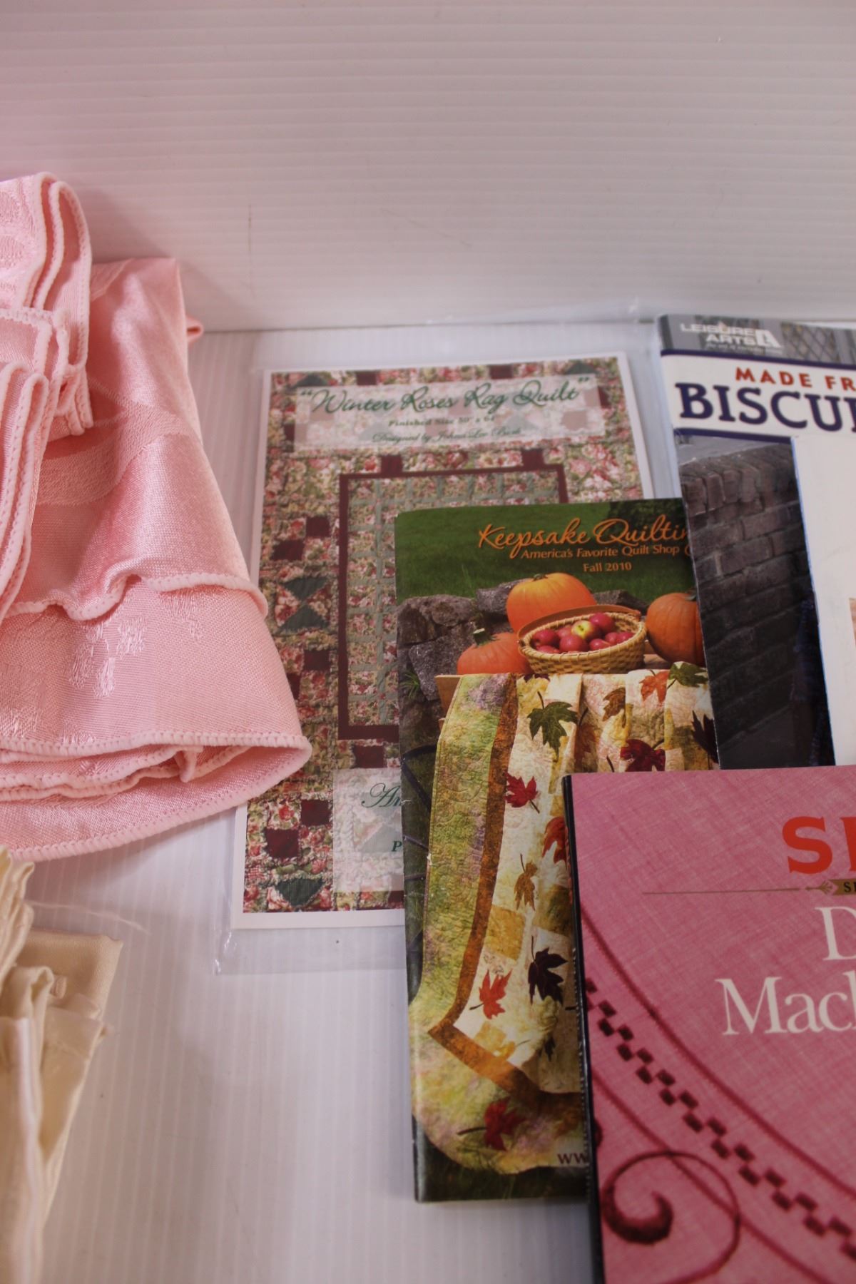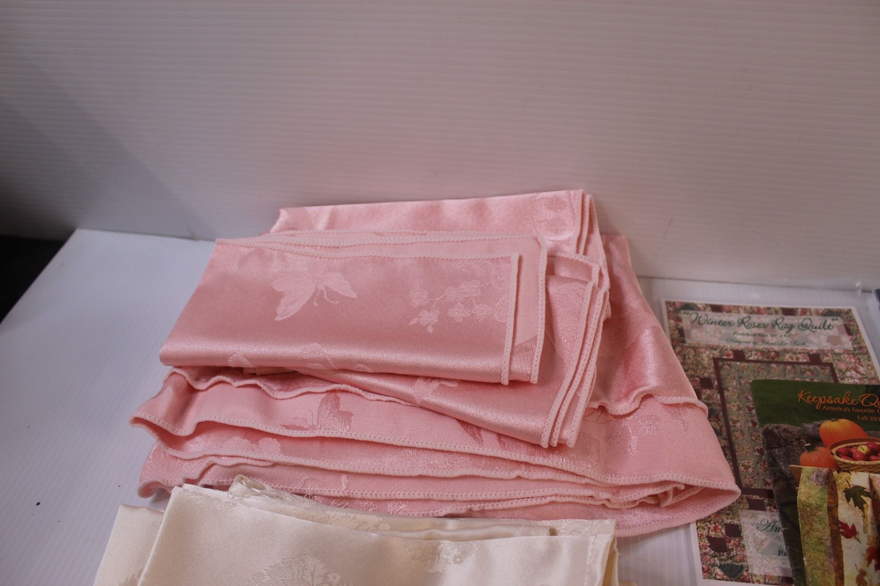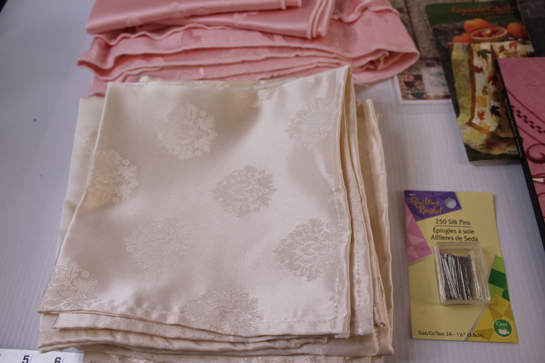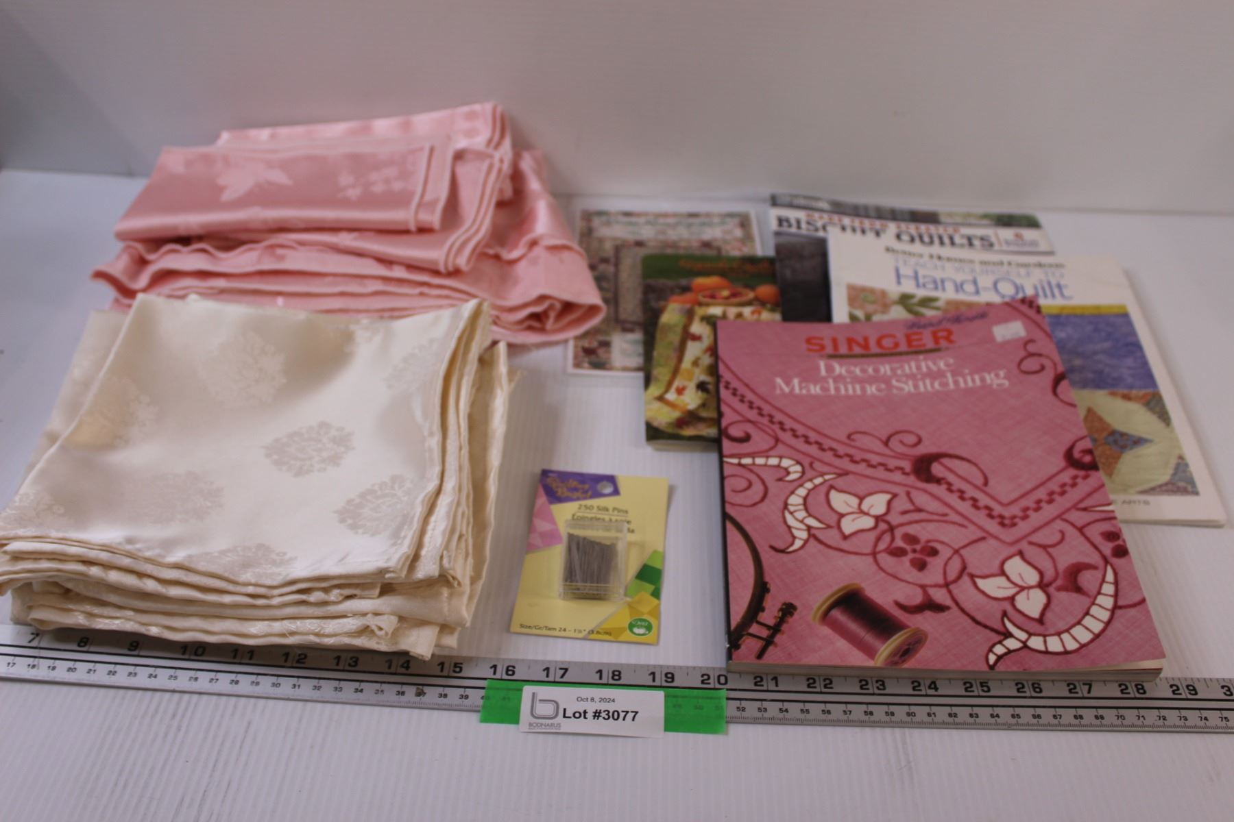 Pink Round Table Cloth & Napkins Set, (8) Off-White Large Napkins, Various Sewing & Quilting Books