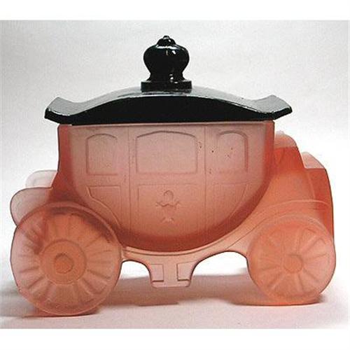 </font></strong>Guaranteed Original - The Royal Coach was designed as a powder jar by A.E. Sierad, patent filed Nov 1930, and the production rights were assigned to the George W. Button Corp and shown on page 47 of Whitmyer - Bedroom & Bathroom Glassware of the Depression Years. Pink satin glass - black lid. The coach measures 7 inches long and 6 inches tall to the top of the crown and - this fabulous Royal Coach powder jar or puff box is in excellent condition.</font>
