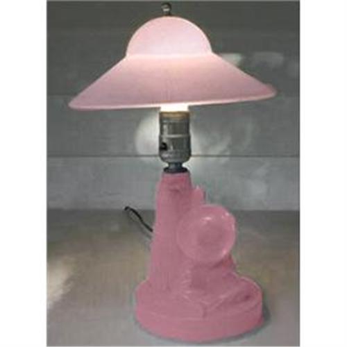 This charming fired on pink Sleeping Mexican vanity or bedside lamp features a Mexican man sleeping, Sombrero over his head, under a cactus. Measuring about 12 inches tall, described and shown on pgs 174-175 of Whitmeyer's - Bedroom & Bathroom Glassware of the Depression Years. With only minimal wear, this stunning Art Deco glass vanity, boudoir or dresser lamp and has all its original hardware. Both the shade and lamp are in excellent condition.