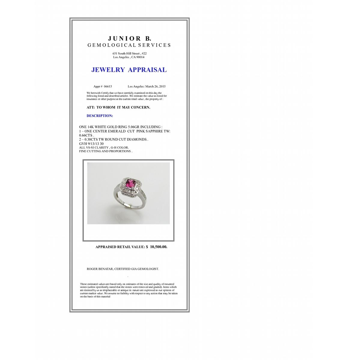 14kt White Gold 5.06 approx grams .66ct Intense Pink Sapphire emerald cut .38ctw Round Diamond G-H color VS-SI clarity size 6.5