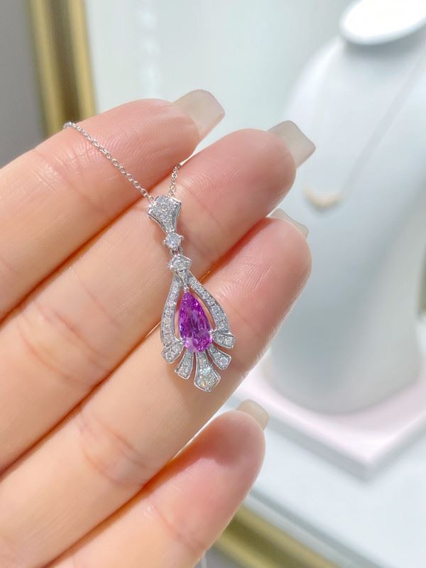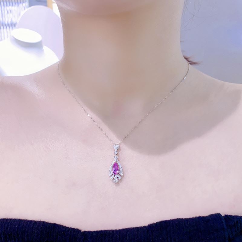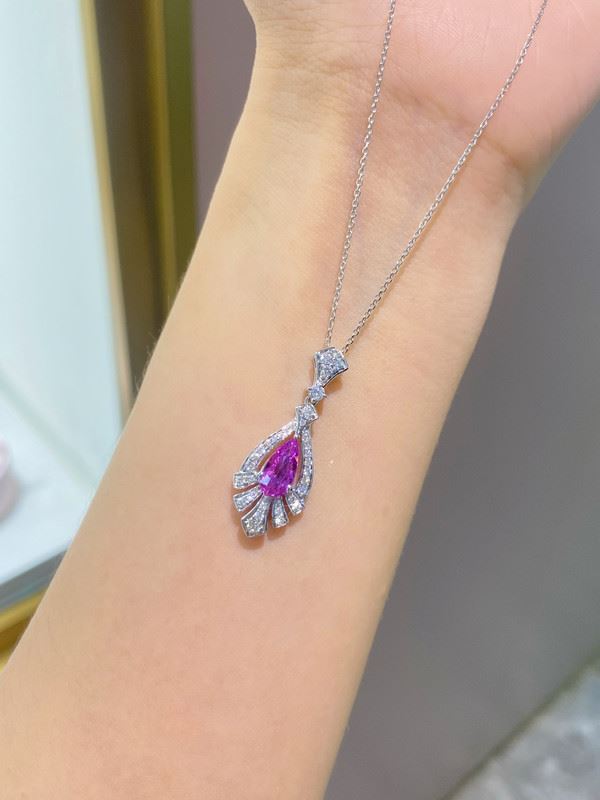 A pear-shaped pink sapphire glows at the center of an openwork fan motif, traced with brilliant-cut diamonds for airy sparkle and graceful length. Suspended from a delicate white-metal chain, it’s soft, refined, and effortlessly transitions from everyday polish to evening elegance. Main Stone: 1.14ct, side diamonds: 0.328ct. Note: Comes with a GUILD certificate.