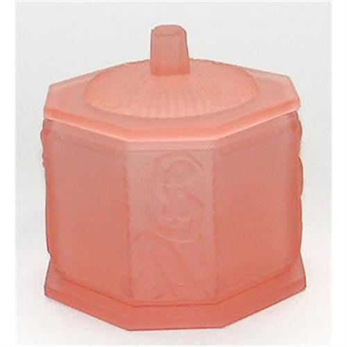 This very high quality Art Deco pink satin glass dresser or powder jar was produced during the 1920s-1930s, presumabely by Frances Mandel, Boston or perhaps for them as another one in our collection bears their label. Octagonal shaped with four 2 inch scalloped bordered sides and four 1 1/2 inch sides that are intricately pressed with several poses of a beautiful lady who is lightly draped with a thin diaphonous shawl. The lid and finial have a raised and ornately sculpted Art Deco design. This exquisite and unusual powder jar with lid measures 5 inches tall x 4 1/2 inches across the footed base, and is in excellent condition.