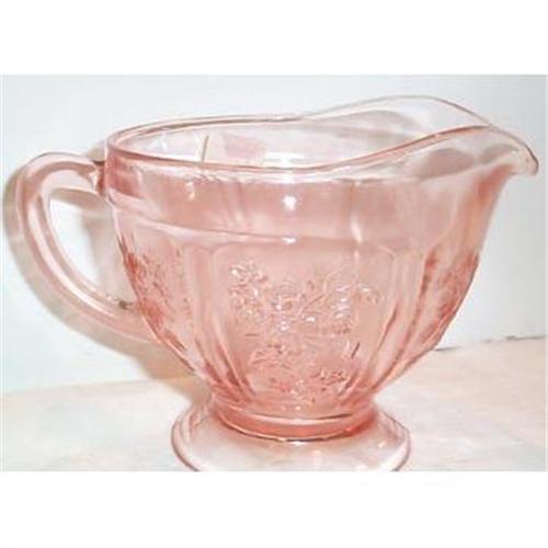 This fantastic Pink Sharon, Cabbage Rose, Footed Depression Glass Creamer is in SUPERIOR condition with no chips, cracks, or dings and it measures 5" from spout to handle and is about 3.50" tall. Sharon was manufactured by Federal Glass Company.