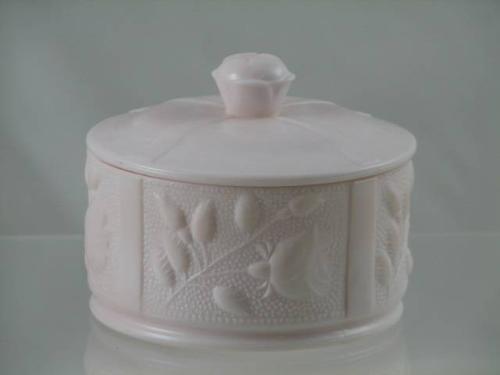 Pink Shell Milk Glass Powder Jar with stylized rose handle on lid and textured glass with roses encircling the base. Produced by the Jeannette Glass Company - Jeannette, Pennsylvania. Introduced in the late 1950's and discontinued in the early 1960's as part of the Pink Shell Milk Glass Line. Dimensions: 3.25"Hx 4.75"D. Excellent Condition, no chips or cracks.