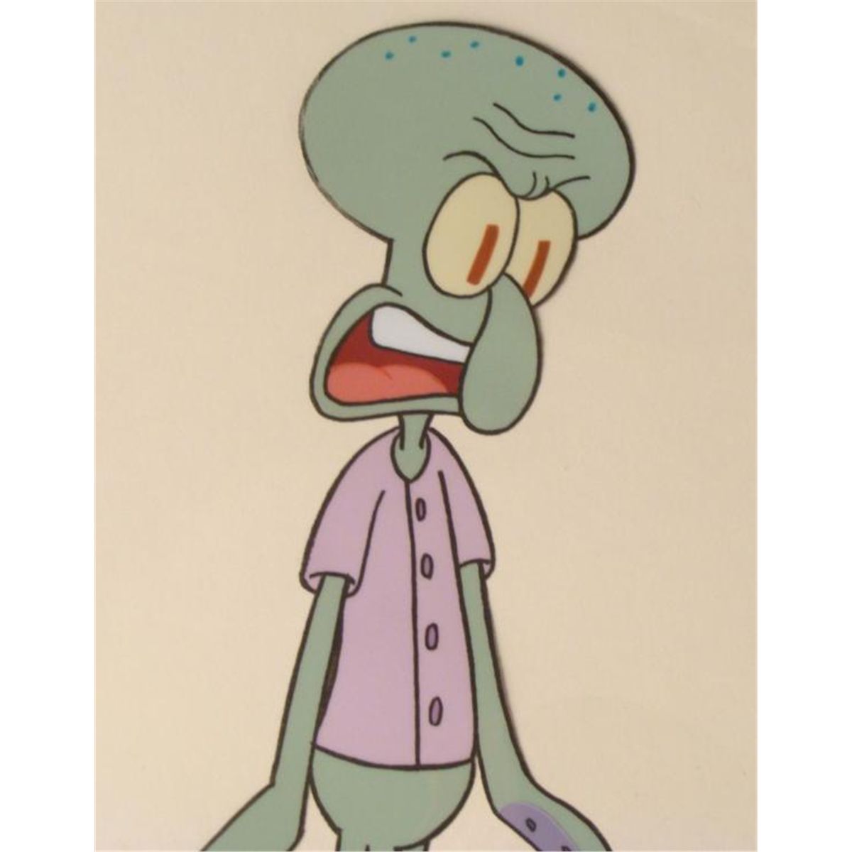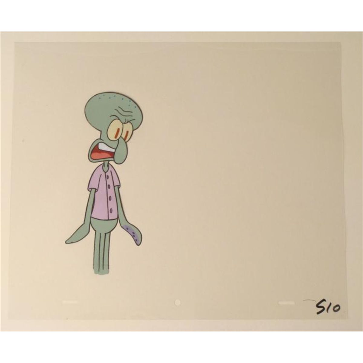 This original animation cel is from the Nickelodeon TV show SpongeBob Squarepants. The story takes place under the deep blue sea in Bikini Bottom, where SpongeBob resides. SpongeBob, who is a yellow, porous sponge, is your typical happy-go-lucky character, as he is always cheerful and enjoys making people laugh. Patrick Star, SpongeBob's neighbor who is a starfish, is your average children's show idiot, as he boasts knowing nothing and is often getting himself into ridiculous situations. Between the homes of these two lies the home of the miserable Squidward, a squid, who is known for being grouchy and playing tricks on SpongeBob and Patrick. Both SpongeBob and Squidward work at the Krusty Krab, a fast food business run by the greedy money-loving Mr. Krabs, a crab, the arch rival of the evil, possibly misunderstood, Plankton. Another neighbor, Sandy Cheeks, an athletic squirrel who normally wears an astronaut's space suit, was introduced in "Tea at the Treedome." She spends most of her time inventing and experimenting. * Squidward has a pink shirt on. * Original Production Animated Cel Overall Size of Cel: 10 1/2" x 12 1/2" Very Good ConditionThis is an original hand-painted cel set-up used in the production of an episode of "SpongeBob SquarePants." Each one-of-a-kind set-up represents a slight change in position of the characters. When individually photographed and projected in rapid succession, the images appear to move. * To create production cels, the original animator's drawing is transferred onto an acetate cel (by hand-inking and/or photo copying). The cel is then hand-painted on the reverse side. * The cel received by the winning bidder may be ever so slightly different from the one in the auction photos. * The cel is ready to be matted and framed. The animator's notations are at the bottom of the cel. *