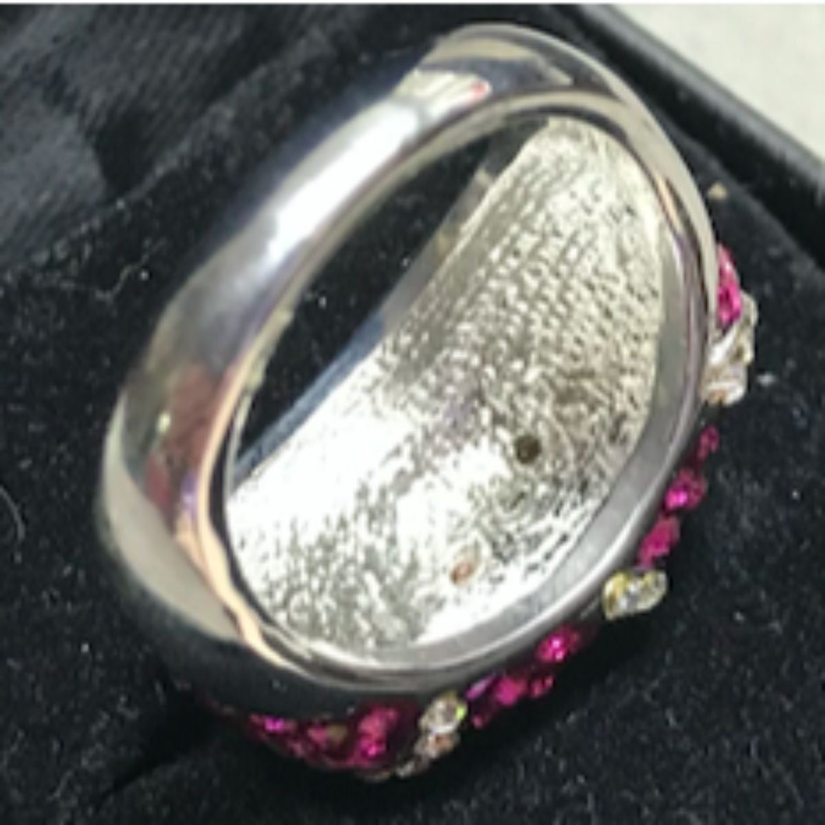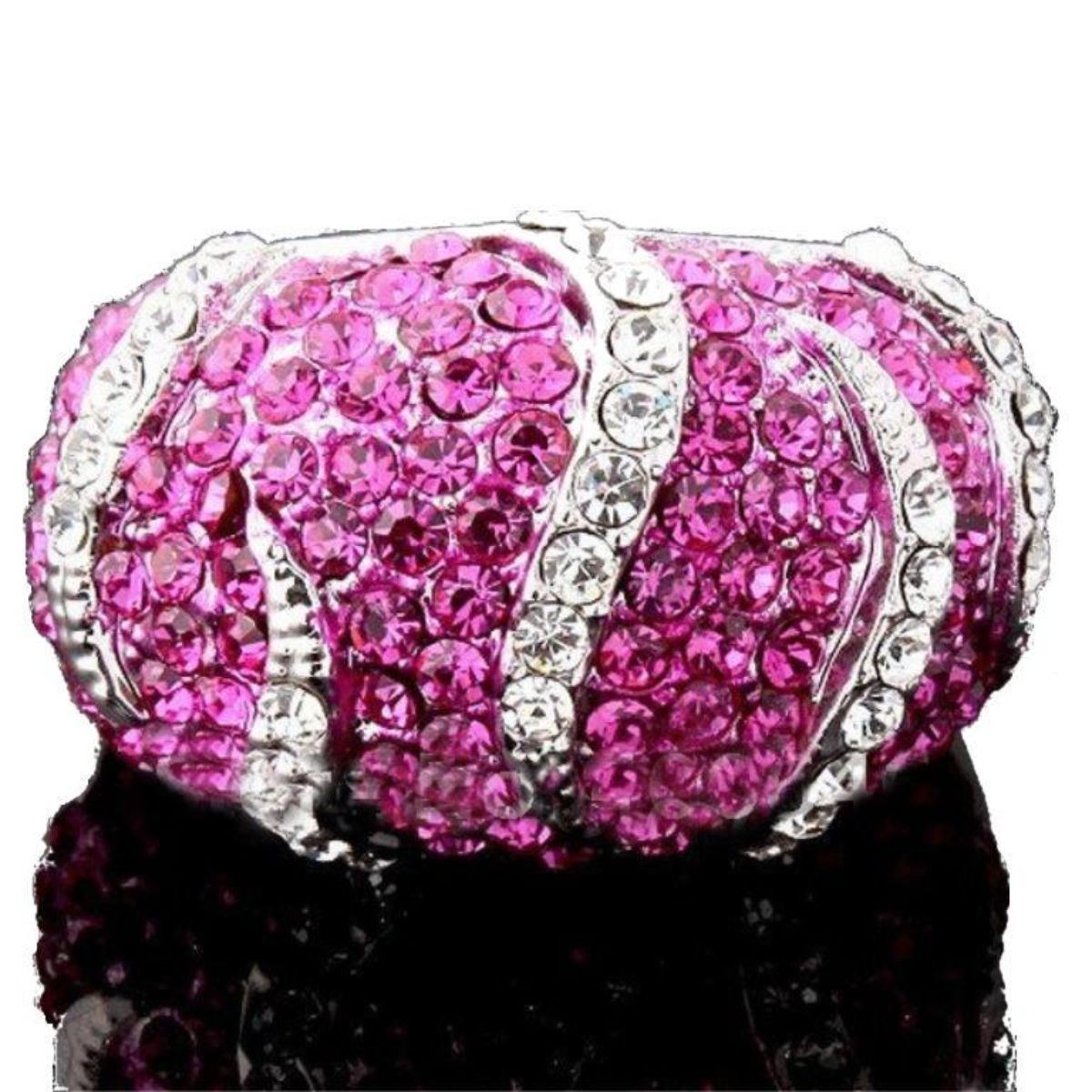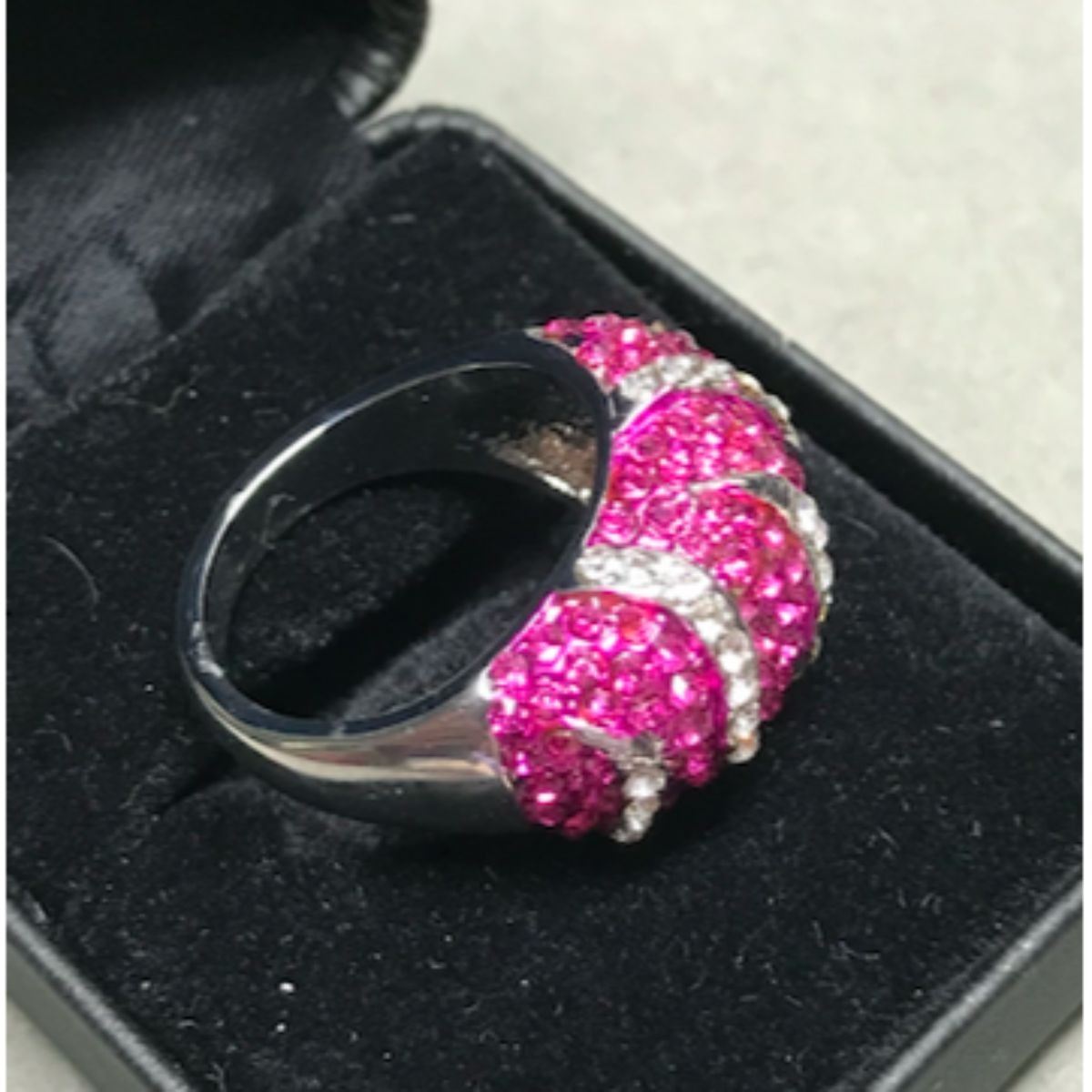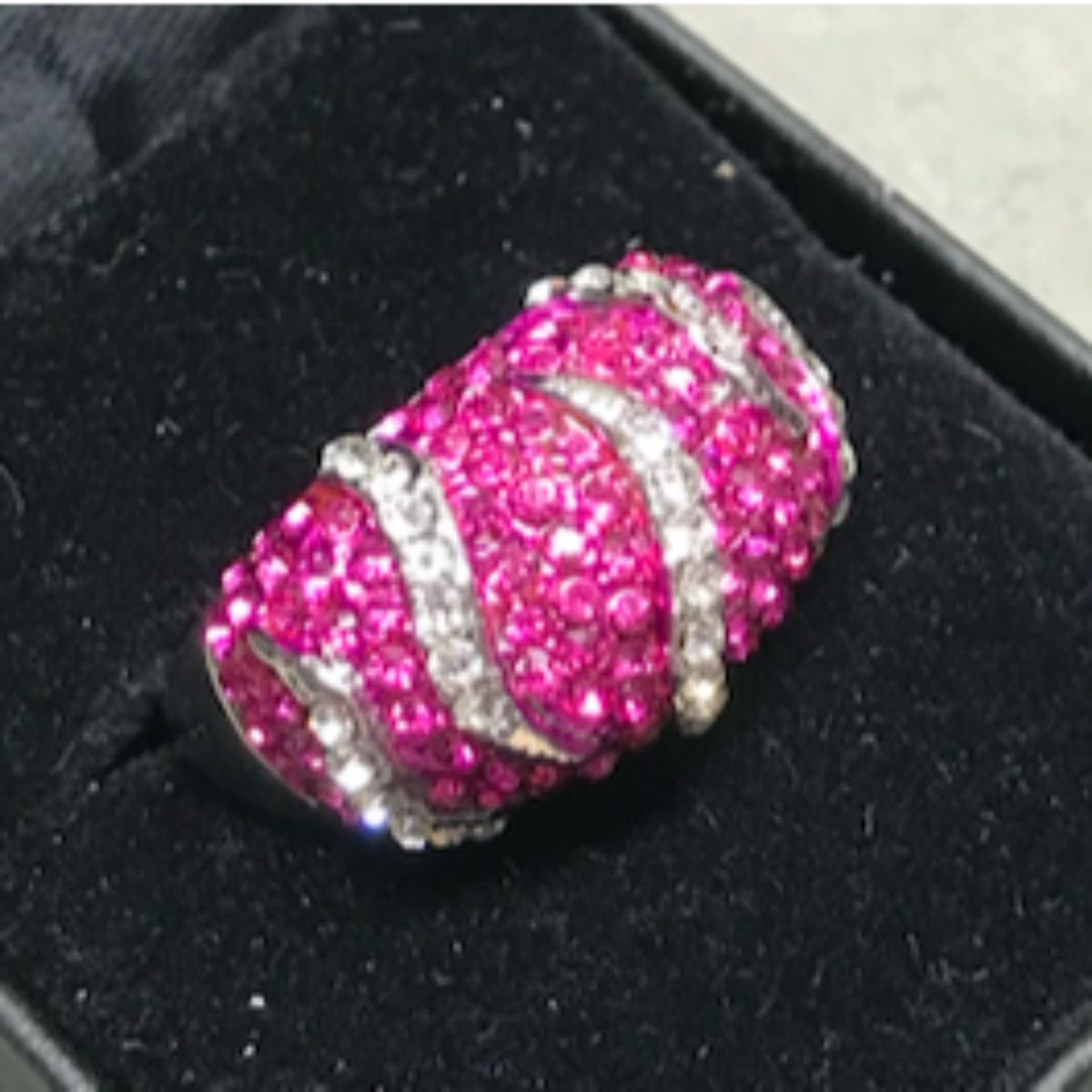 Designer pink & clear Swarovski crystals, set into a "wild animal" pattern, white metal ring. Size 7.5. One of several similar rings from a closed jewelry gift shop.