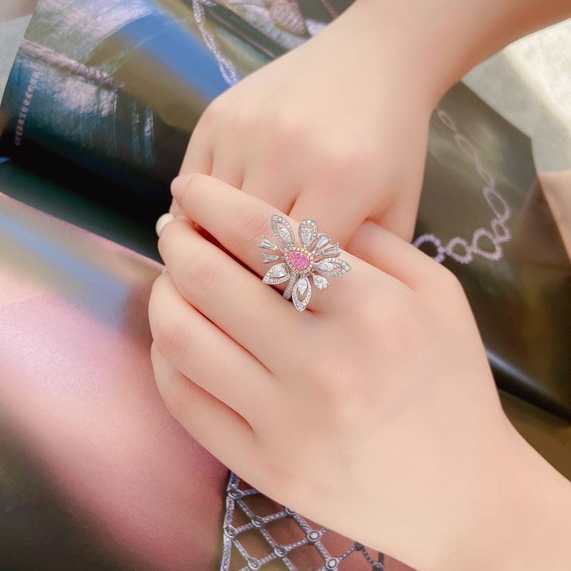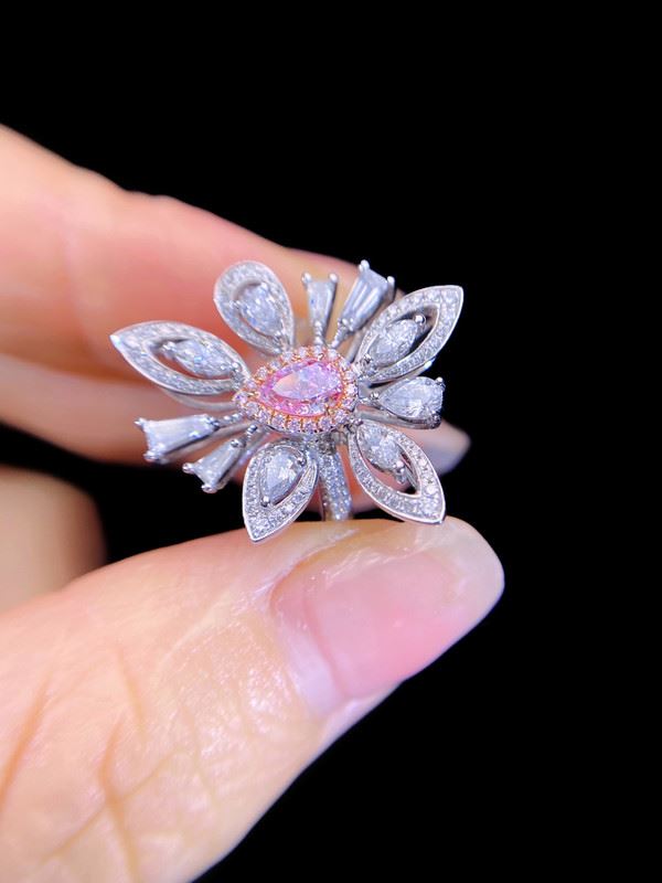 A pink pear-shaped diamond sits at the center, surrounded by a constellation of white diamonds in varied cuts forming a blooming floral silhouette. Graceful and distinctive, it embodies femininity with artistic flair.Ring size: 6, circumference: 52 mm, diameter: 16.6 mm, main diamond: 0.43 ct, side diamonds: 1.335 ct. Note: Comes with a GIA Natural Diamond Report.