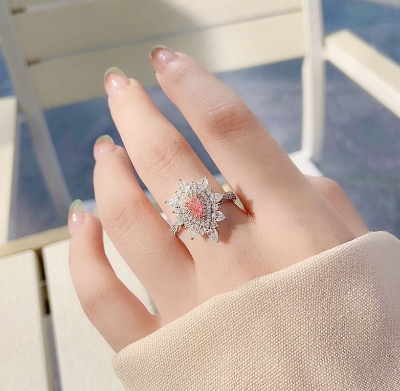 This pink teardrop ring features a beautifully crafted pink teardrop diamond at its center, radiating a captivating glow and color. Surrounding the main stone are delicately set diamonds arranged in a floral-like design, creating an unparalleled brilliance. The band is subtly adorned with smaller diamonds, enhancing the overall elegance. A perfect blend of sophistication and modern design, this ring is suitable for both everyday wear and special occasions, embodying luxury and refinement.Ring size: 6, circumference: 52 mm, diameter: 16.6 mm, main diamond: 0.25 ct, side diamonds: 1.19 ct.Note: Comes with a precious metal authentication certificate.