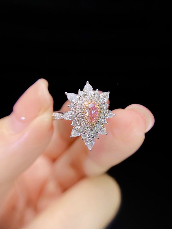 This pink teardrop ring features a beautifully crafted pink teardrop diamond at its center, radiating a captivating glow and color. Surrounding the main stone are delicately set diamonds arranged in a floral-like design, creating an unparalleled brilliance. The band is subtly adorned with smaller diamonds, enhancing the overall elegance. A perfect blend of sophistication and modern design, this ring is suitable for both everyday wear and special occasions, embodying luxury and refinement.Ring size: 6, circumference: 52 mm, diameter: 16.6 mm, main diamond: 0.25 ct, side diamonds: 1.19 ct.Note: Comes with a precious metal authentication certificate.
