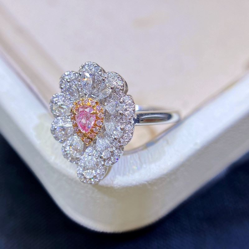 A pink pear-shaped diamond rests at the center, encircled by petal-like white diamonds. The sleek straight band design enhances its refined elegance, blending grace and sophistication in perfect harmony.Ring size: 6, circumference: 52 mm, diameter: 16.6 mm, main diamond: 0.159 ct, side diamonds: 0.634 ct. Note: Comes with an AGL certificate and a domestic jewelry identification certificate.