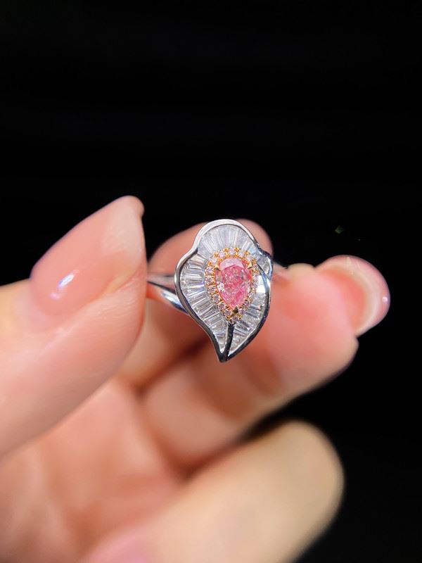 This pink teardrop-shaped ring features a unique design, combining delicate pink diamonds with exquisite white baguette diamonds. The central pink teardrop diamond radiates a soft glow, surrounded by tiny yellow diamonds and streamlined white diamonds, creating the effect of a blooming flower. The twisted band adds a modern touch, making it a perfect jewelry piece for formal occasions or romantic moments.Ring size: 6, circumference: 52 mm, diameter: 16.6 mm, main diamond: 0.30ct, side diamonds: 0.299 ct. Note: Comes with a GIA Natural Diamond Report.