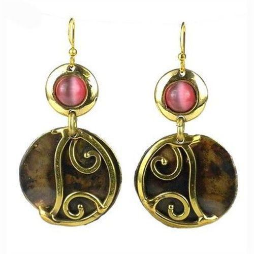 Pink Tiger Eye and Brass Scroll Earrings - Brass Images **|**|** Circles of brass accented with scrolls of polished brass hang from pink tiger eye stones inlaid in polish brass on these earrings with brass hooks made by South African artisans. The coloration on the brass is achieved by applying high heat.Dimensions: 30 mm wide x 45 mm long. #H-464-232197