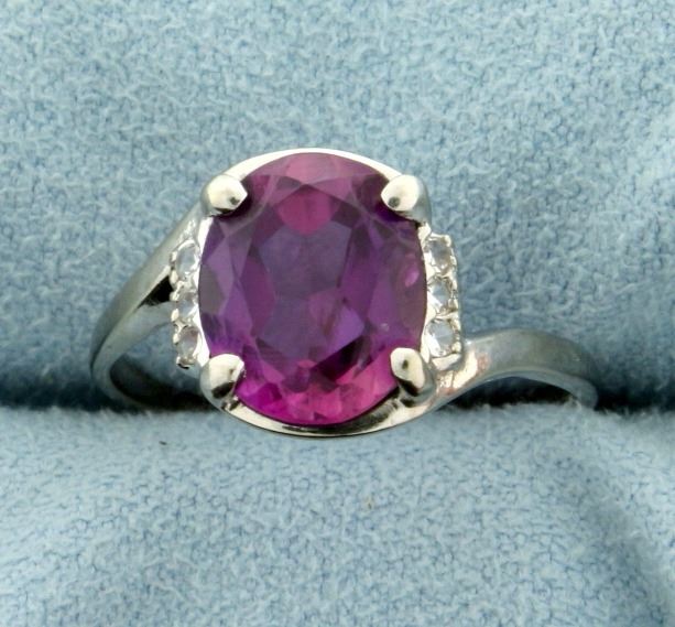 In 10k white gold. Containing a natural 10x8mm oval pink topaz gemstone with a beautiful and unique bright violet pink color. Also contains six .01ct cz gemstones. Size 7. 2.2g.