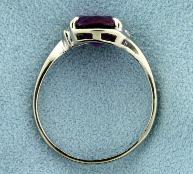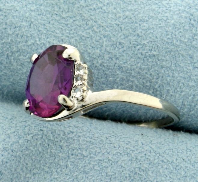 In 10k white gold. Containing a natural 10x8mm oval pink topaz gemstone with a beautiful and unique bright violet pink color. Also contains six .01ct cz gemstones. Size 7. 2.2g.