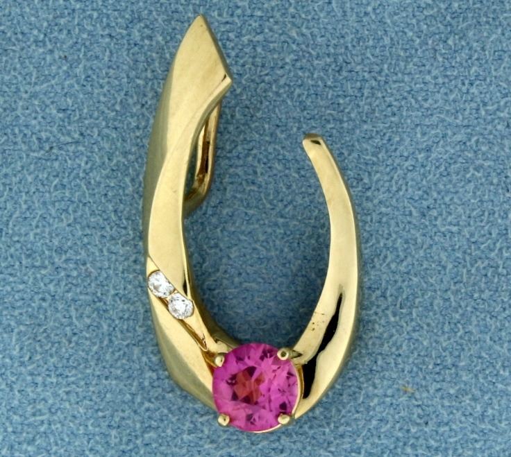 In 14k yellow gold, containing 1ct bright pink topaz gemstone with excellent clarity. Also contains two very high quality .03ct diamonds - VS clarity/F color. 1 1/4 inch long. 3.9g.