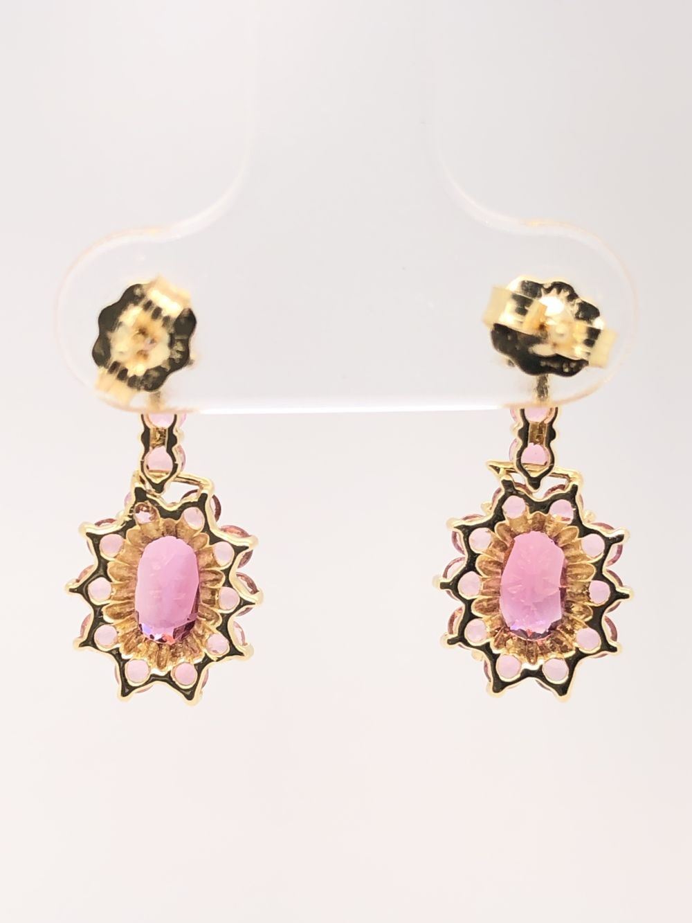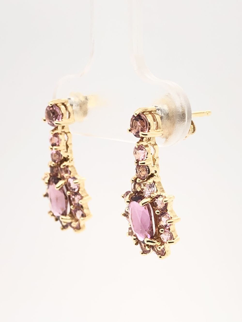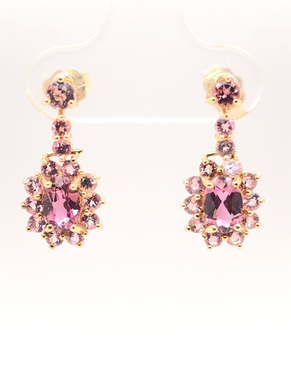 Genuine Tourmaline Earrings.& nbsp; This pair of 14 karat yellow gold earrings feature approximately 2.00 carats of oval-cut and round, faceted pink tourmalines that are all prong-set.& nbsp; The earrings hang approximately 3/4& quot; and have hinged settings.& nbsp; They attach to the earlobes with posts and firm friction backs.& nbsp; This is a preowned, estate item in excellent condition.