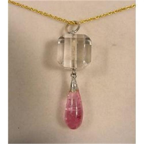 A dainty pendant on 14ct gold chain - a bevel sided clear cube of rock crystal, with an oval teardrop of pink tourmaline suspended from it. Chain measures 42cm long (16.1/2 inches).
