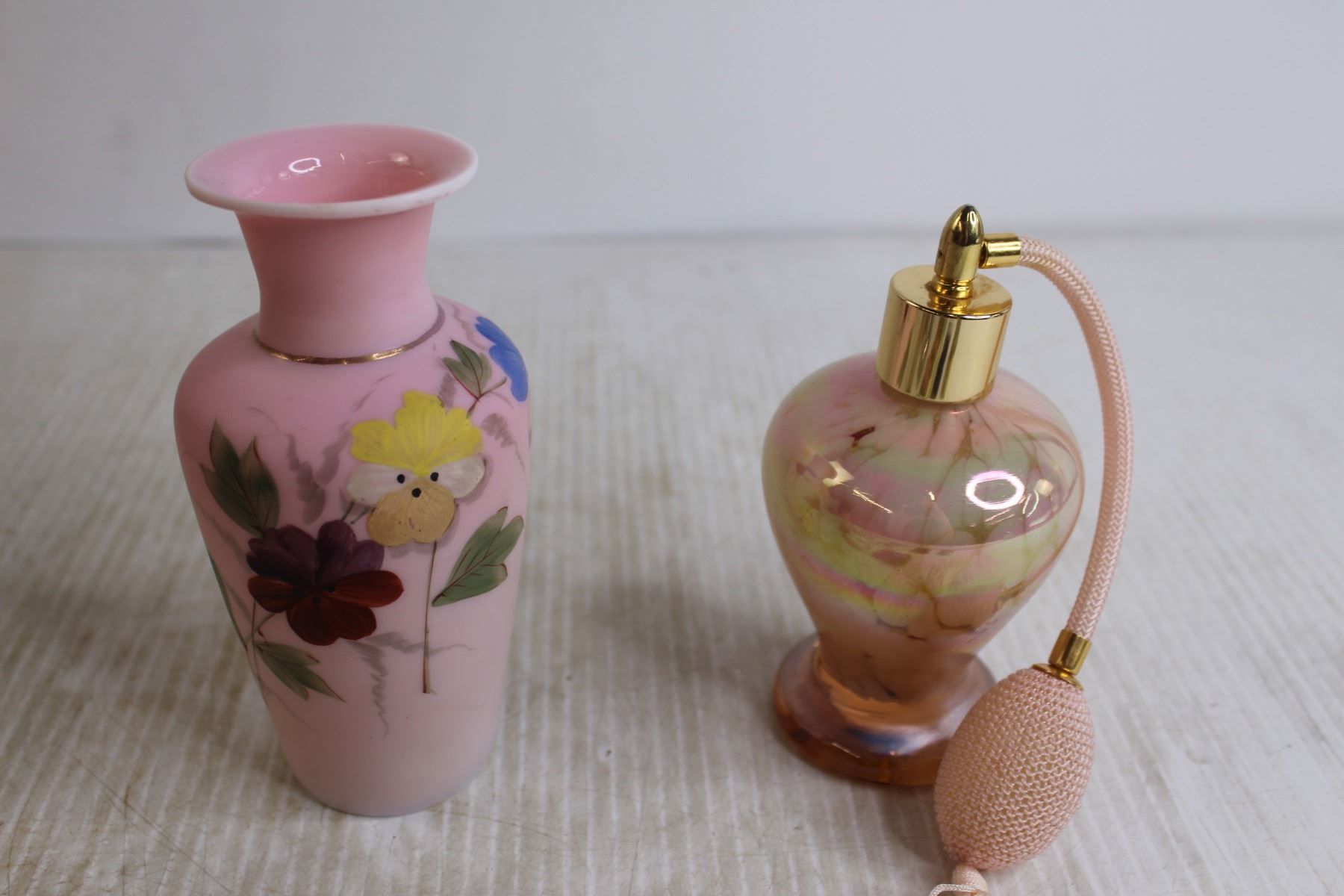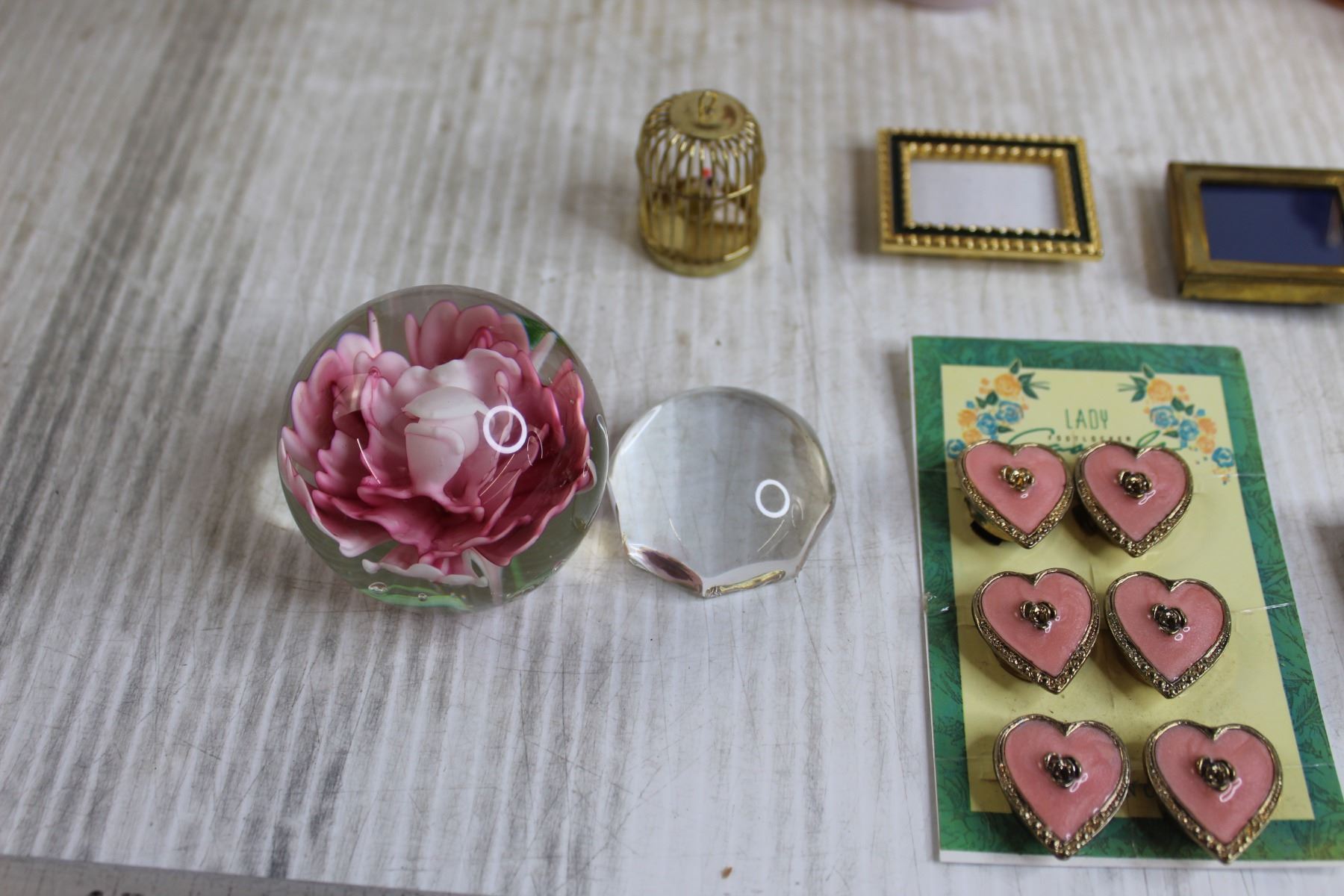 Pink and Brass Vase, Atomizer, (3) Mini Picture Frames, Button Covers, Pill Box, (2) Paper Weights, Mini Bird Cage
