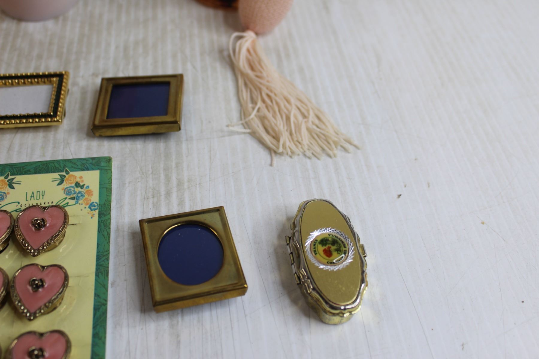 Pink and Brass Vase, Atomizer, (3) Mini Picture Frames, Button Covers, Pill Box, (2) Paper Weights,