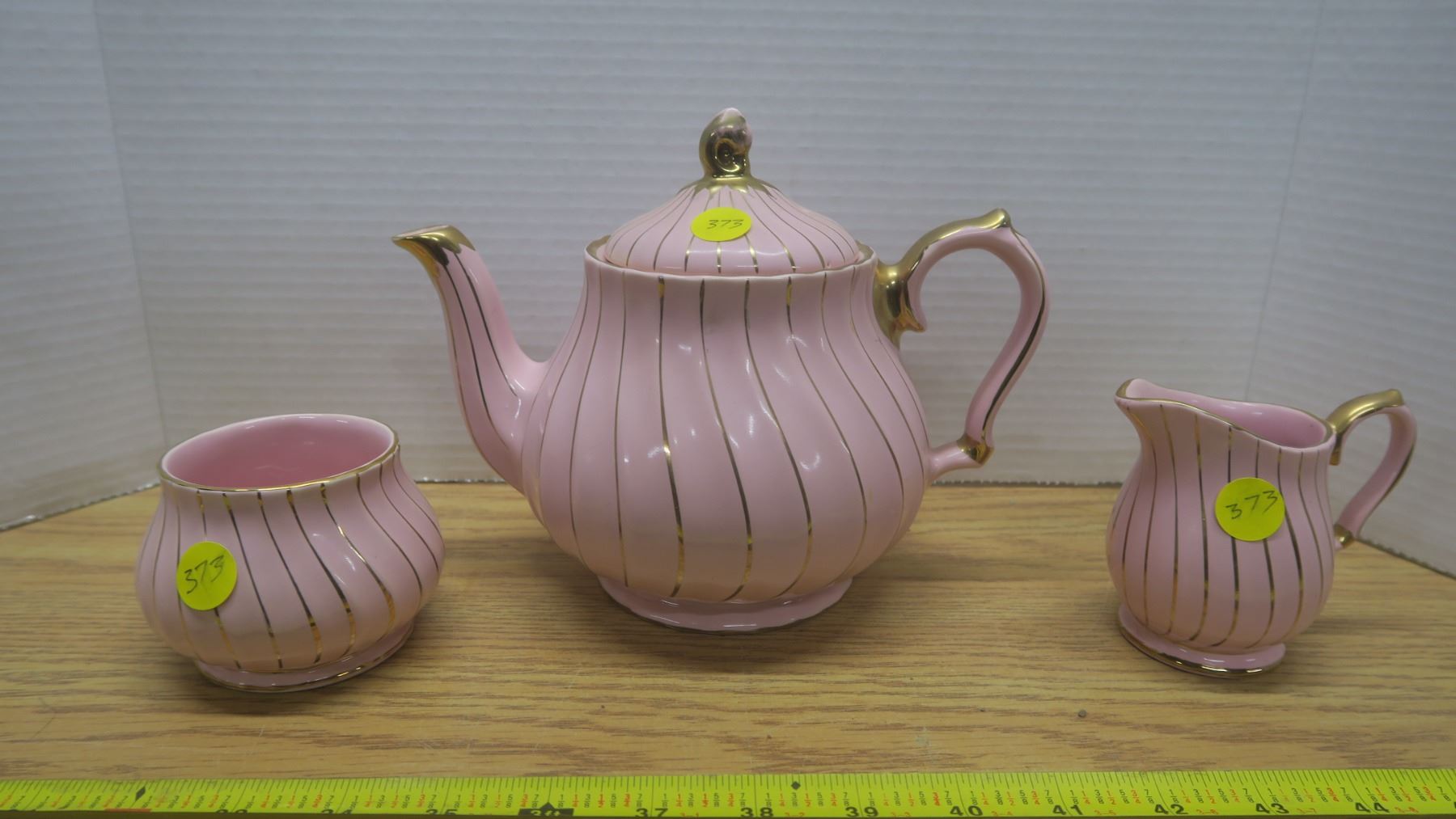 Pink and Gold Colored Teapot, Cream, and Sugar