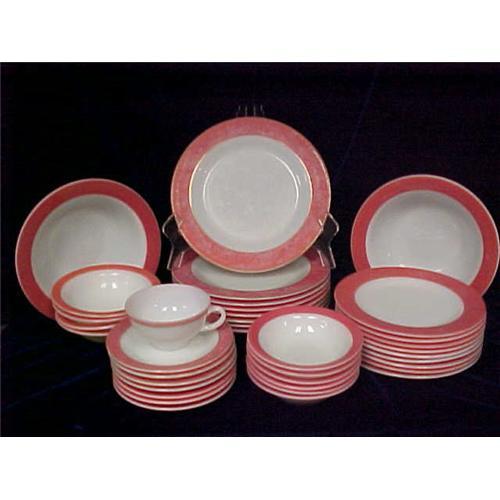 Pink and White Gold Trim Pyrex Dinnerware 37 pieces- Includes 8 10" dinner plates, 9 8" luncheon plates, 7 6" saucers, 1 cup, 2 9" serving bowls, 4 6.5" bowls, and 6 5.5" bowls. Adorable collector's set! In good condition despite sufficient fading of the colors. All measurements are approximate.
