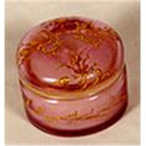 Pink crystal, small lidded box with raised gilt enamelled accent with swan down puff. Very lovely.