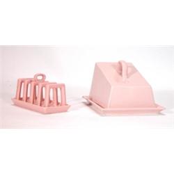 Pink glazed Carltonware cheese dish and cover and matching toastrack, marks to base, largest 16cm in length