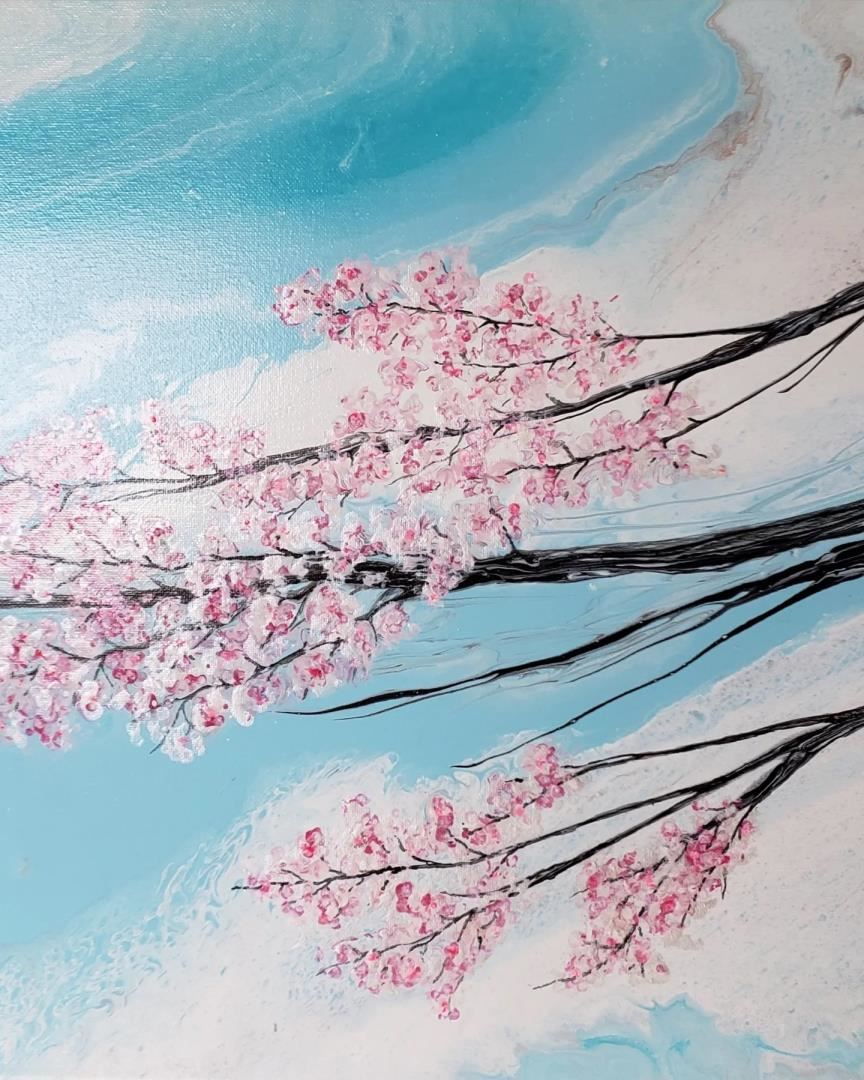 A 16x20" original acrylyc on stretched canvas , by artist Katie D., featuring a blooming sakura, bringing renewed innocence of spring. w/COA