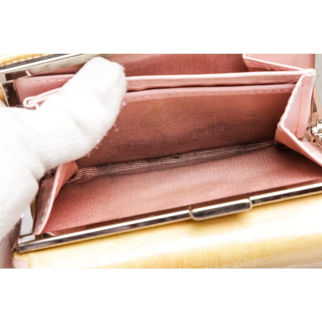 Crafted out of yellow metallic floral print patent leather, light pink leather trim, back coin pocket, and snap closure front. Inner light pink leather lining, eight card slots, and dual bill pockets.