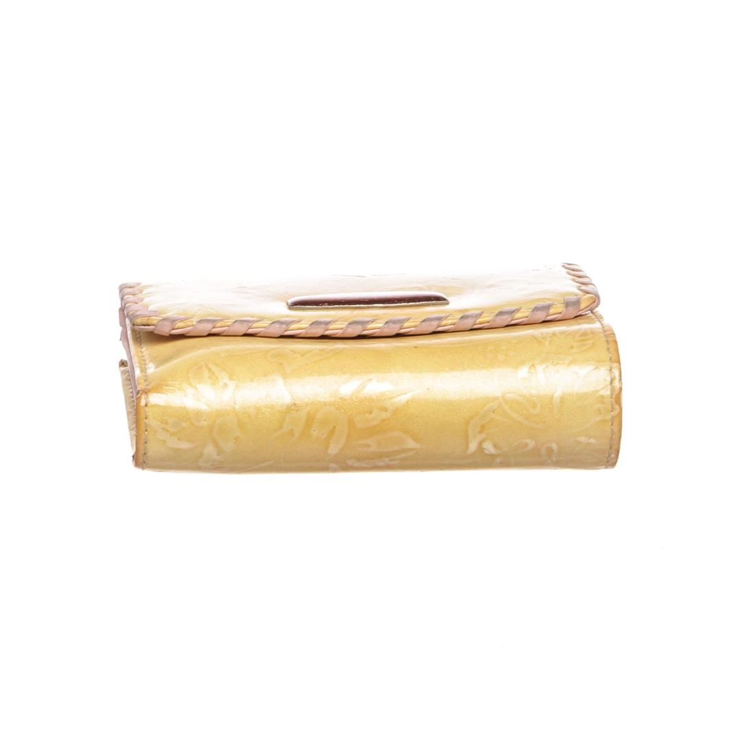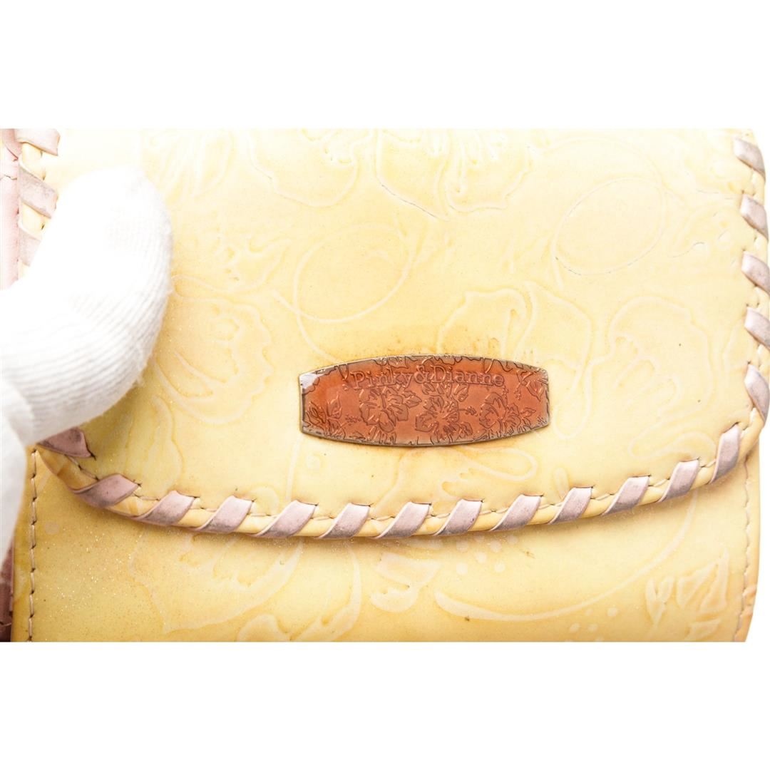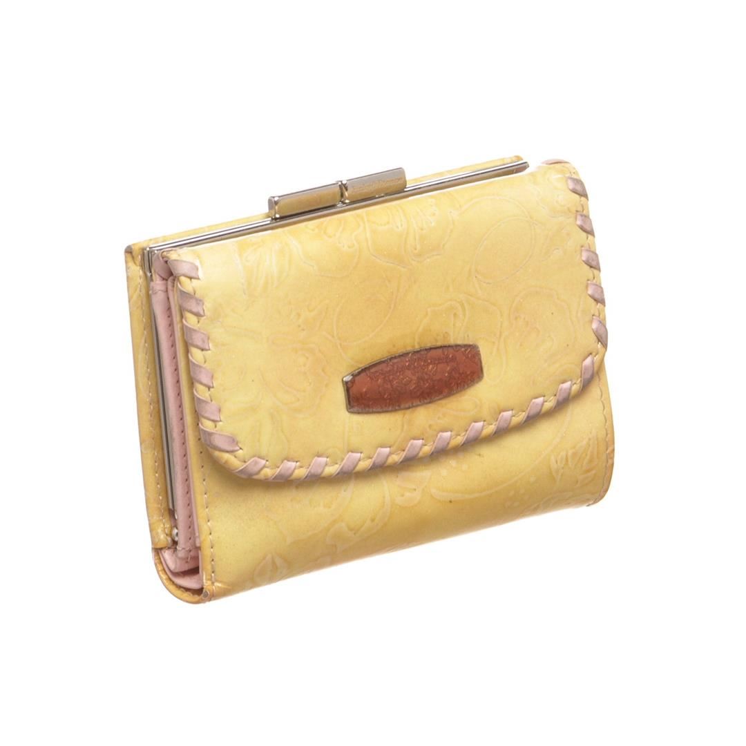 Crafted out of yellow metallic floral print patent leather, light pink leather trim, back coin pocket, and snap closure front. Inner light pink leather lining, eight card slots, and dual bill pockets.